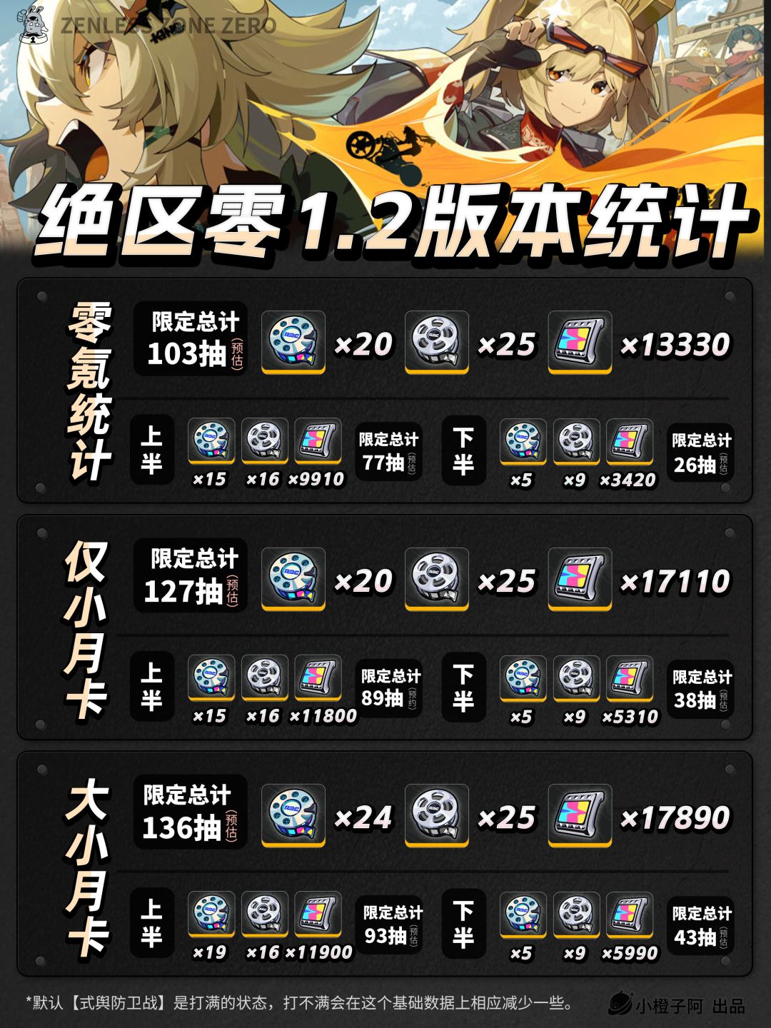 UID:15024695 大家好!这里是小橙子阿! 这一篇是v1.2新版本抽数统计 整体分为总体统计与各内容版块统计 总体统计分为了:零氪、小月卡与大小月卡 方便大家根据自身需求选择查阅 本攻略适用版本:v1.2丨火狱骑行 查阅须知: ① 版本持续时间【2024.9.25~2024.11.05】共计:42天 ② 整体产量为预估产量,准确数量请按v1.2实装为准。 ③ ·第一页的统计中上半产量远远