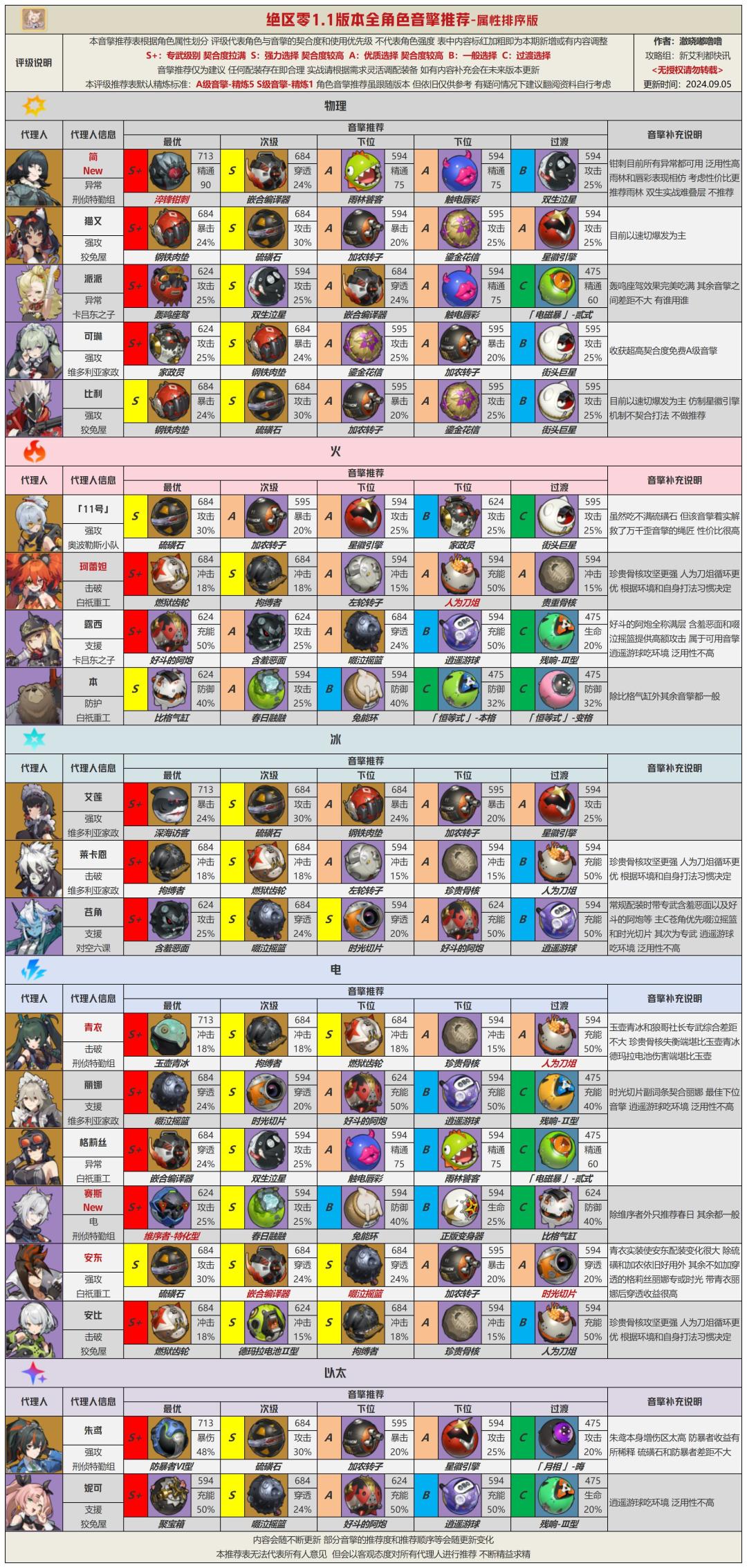 UID 10449294 各位绳匠们好呀,这里澈晓嘟噜噜! 绝区零在9月1日迎来式舆更新,9月4日简和赛斯实装,随着玩家对各种角色的打法深入探索,各角色的表现和配队培养等也有所变动。 今天为大家带来1.1版本全角色评级配队推荐,方便大家了解绝区零在当前版本的角色培养优先级,以及阵容配队等问题。 一切照旧,推荐榜分为两种排序方式,各位绳匠根据自己的阅读习惯保存即可。 如果对本期内容比较满意,欢迎点波