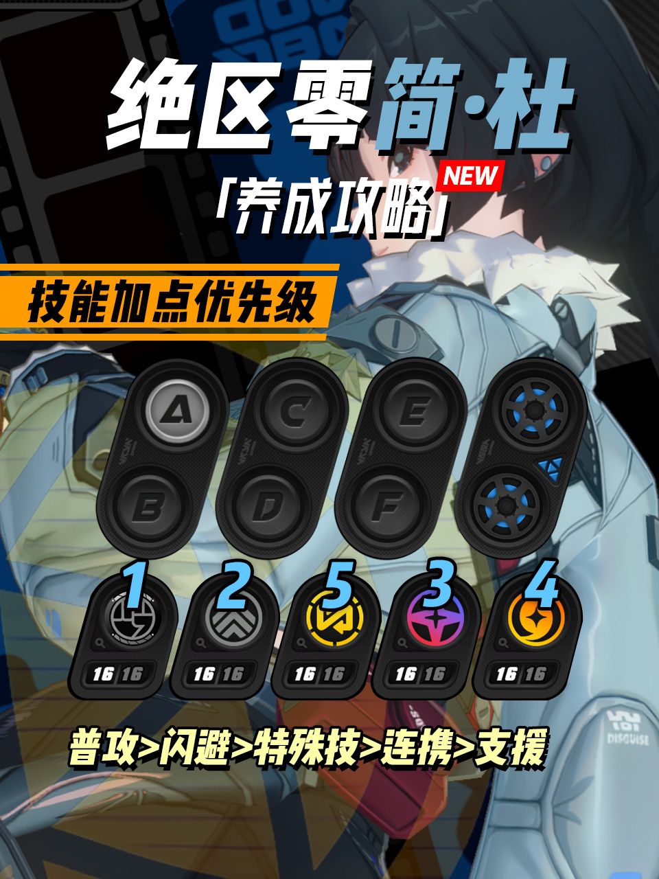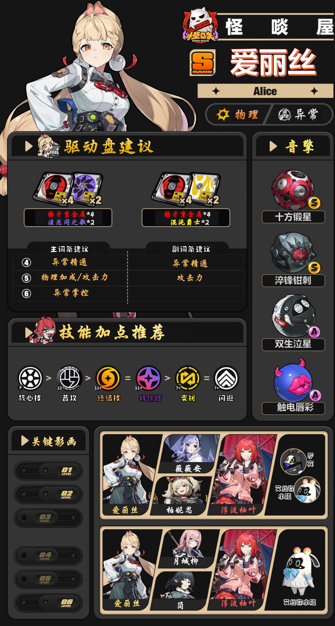 UID:10809853 爱丽丝是S级异常体系依靠属性异常效果进行输出的代理人,她可以通过触发【极性强击】效果,无视属性异常积蓄进度对敌人造成一次原本【强击】效果的伤害,还可为敌人附加持续伤害状态。 影画&音擎优先度:0+0→0+1→2+1 技能加点:优先提升核心技和普攻 音擎推荐:优先推荐专属音擎【十方锻星】,S级音擎里唯一可提供异常掌控,爱丽丝可以把异常掌控转化为精通,很契合爱丽丝 其次是简专