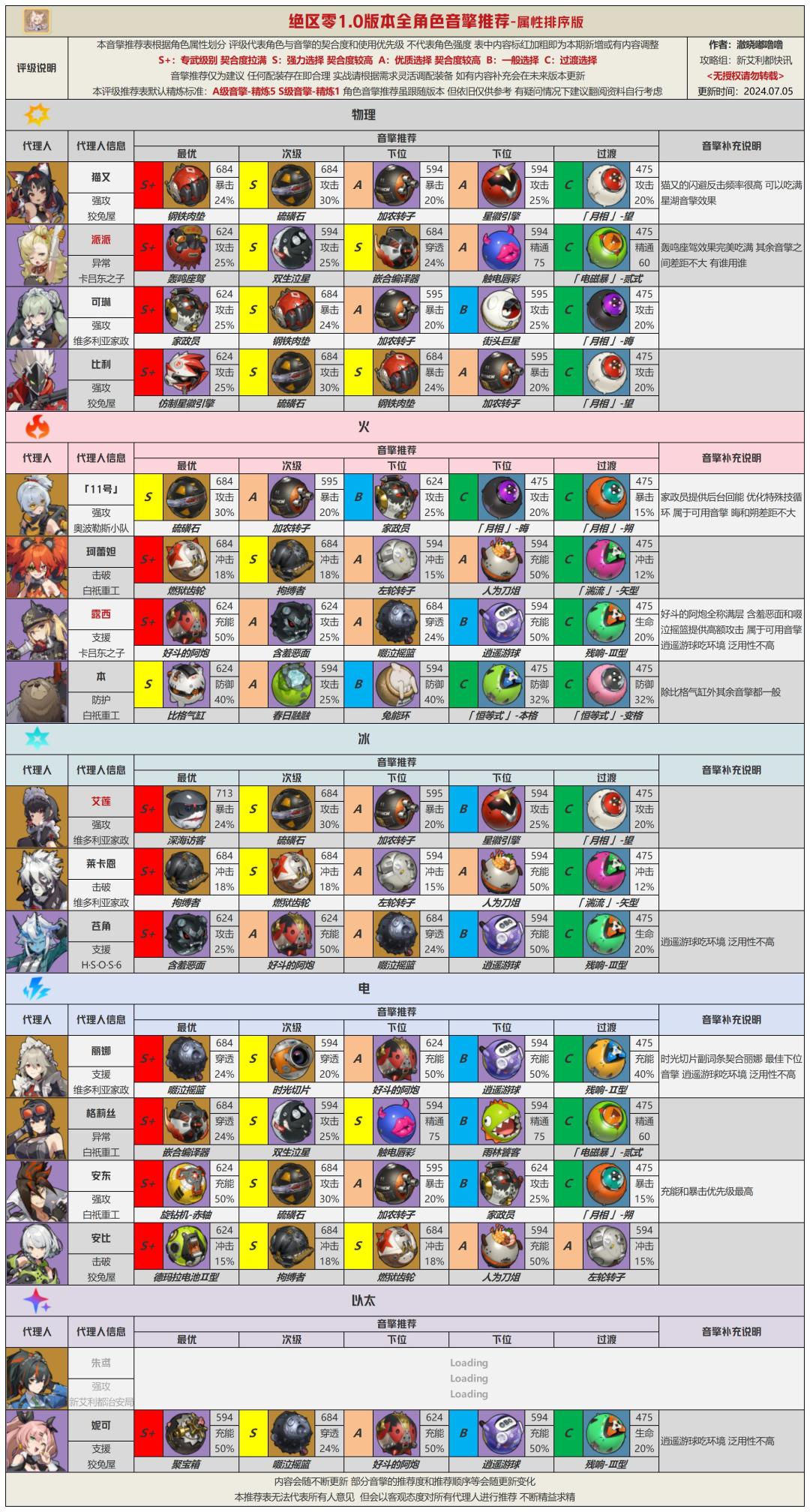 UID 10449294 各位绳匠们好呀,这里澈晓嘟噜噜! 目前绝区零还处于开荒时期,再加上绝区零的音擎在公测版本经过了大批量的调整,外界的很多三测攻略都已经不再适用。在此基础上,相信有不少绳匠都会比较纠结如何为角色选取音擎。 今天澈晓就为大家带来一期绝区零干货满满的1.0版本全角色音擎推荐一图流,相信恶补完本期攻略,你会对绝区零的角色强度信手拈来。 一切照旧,推荐榜分为两种排序方式,各位绳匠根据