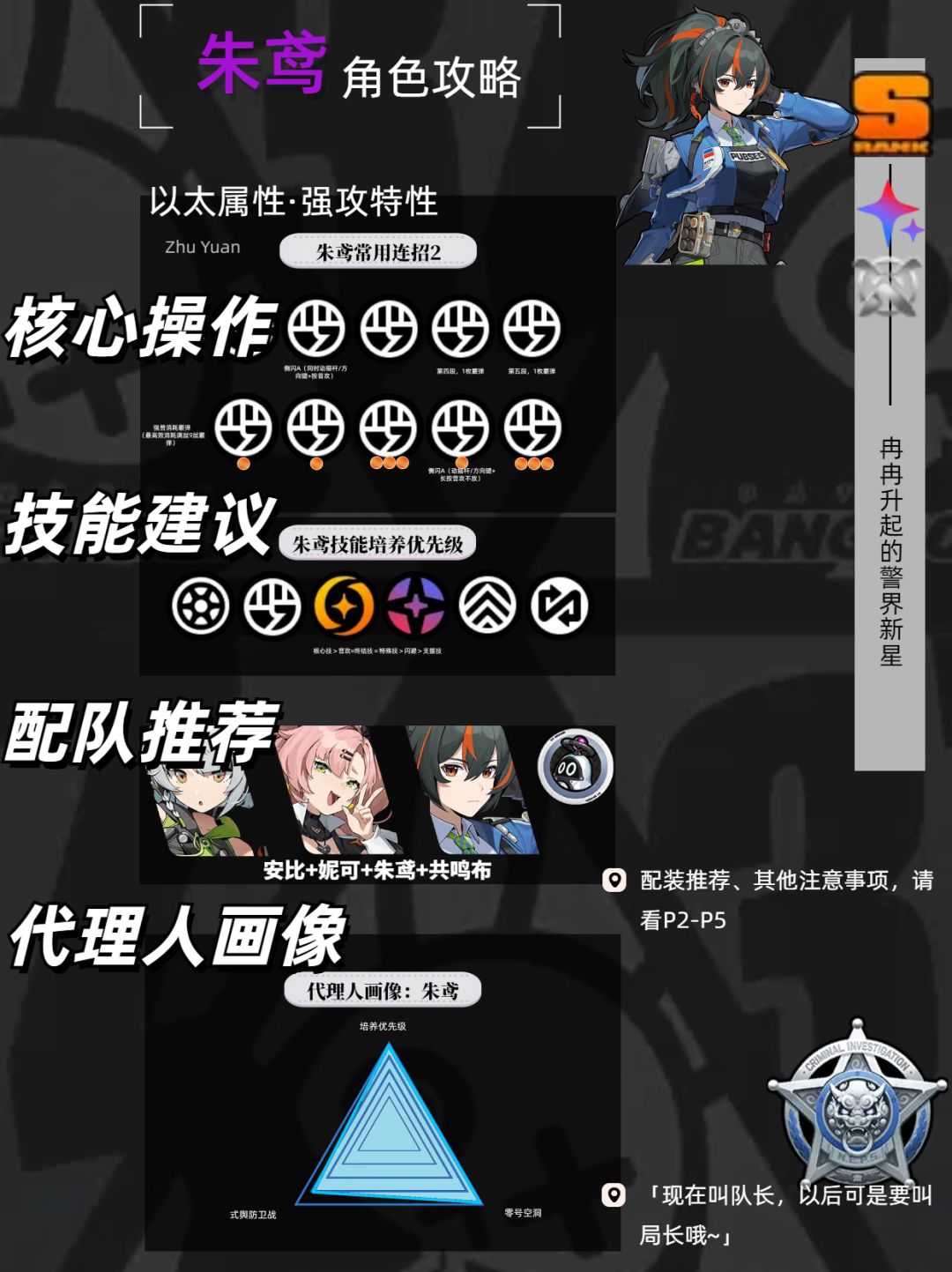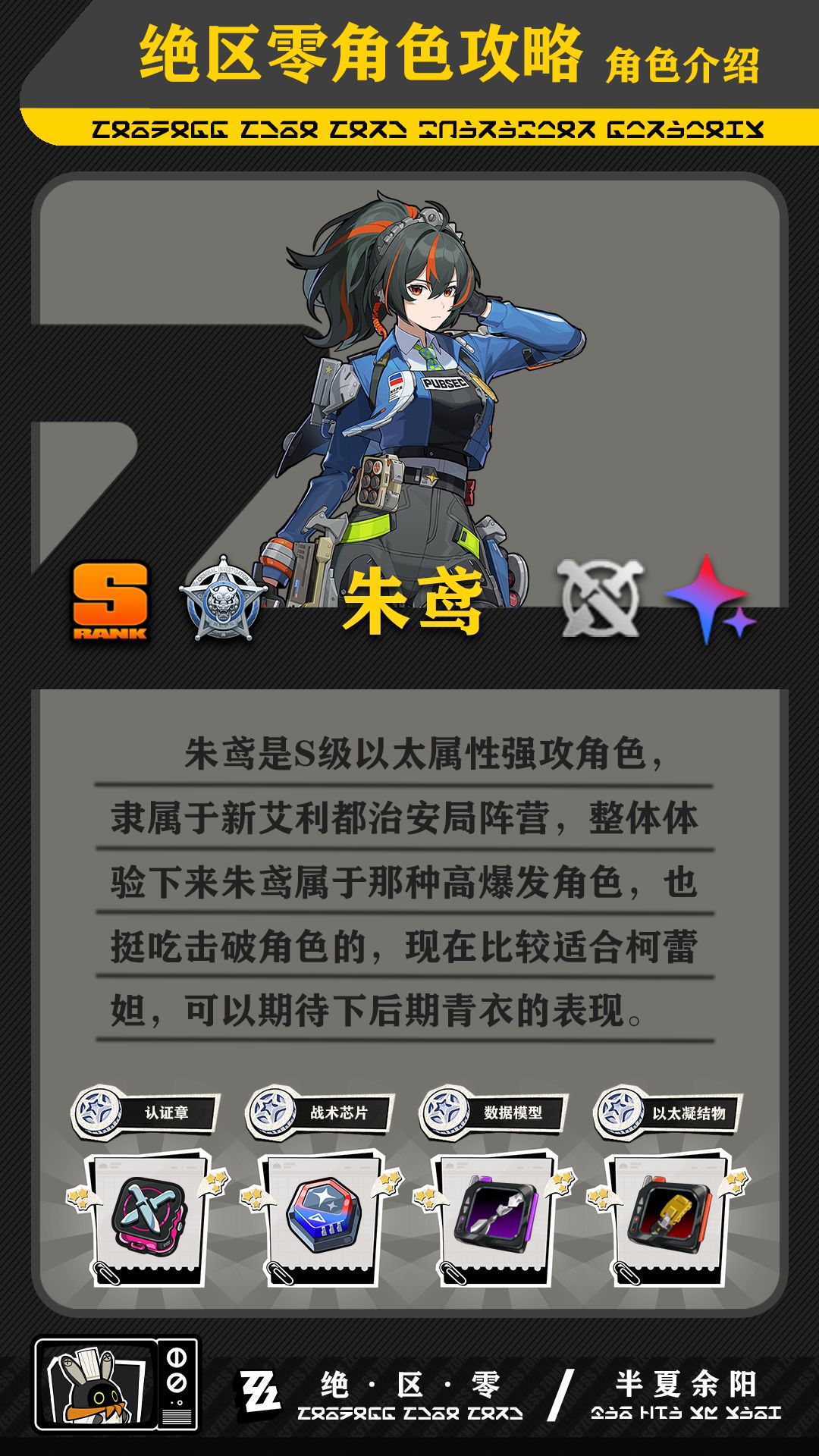 UID:10268057 hi各位绳匠们大家早上中午晚上好呀,这里是为大家带来角色攻略的青枫 本期带来的是「朱鸢」的角色攻略,她是〖新艾利都治安局〗的新晋治安巡查官。刑侦科的精锐,宛如后辈的前辈; 🧿Fairy:接下来以图鉴的形式简要整理一份「朱鸢」的养成参考,并主要针对技能机制做下图文解析,帮助绳匠们快速认知角色特性及养成方向,其他角色攻略也会陆续整理,嗯呢嗯呢~! 朱鸢--S级以太属性强攻角色
