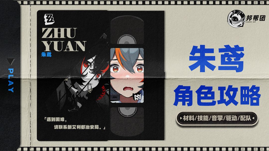 哈喽喽,这里是来自邦布帮帮团攻略组的小橙子阿。 这一期我们将带来的是绝区零第二位限定S角色,来自“新艾利都治安局”阵营的朱鸢,这里更多的是给各位小可爱呈现出一图流,方便大家阅览,公测后橙子再将详细攻略呈上。 「朱鸢」是一位以太属性的强攻角色,朱鸢更是一个速切C,主要通过强化特殊技、终结技等方式积攒【强化霰弹】数量,然后长按普攻消耗掉【强化霰弹】数量,快速打出爆炸伤害。 因此建议朱鸢音像携带【摇摆爵