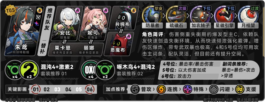 uid:11365266 ★角色介绍 朱鸢作为以太属性强攻输出代理人,通过支援、强化特殊技、终结技等方式获得[强化霞弹]之后长按普攻进行输出 ★技能优先级 普攻>特殊技>连携技>闪避>支援技, 朱鸢主要是通过长按普攻消耗【强化霰弹】进行输出,【强化霰弹】主要依靠强化特殊技与终结技与支援技积累。 ★核心影画:1,6 1:快速装填:额外补充【强化霰弹】,延长输出时间 6:扩容能源包-叁型:降低强化特殊
