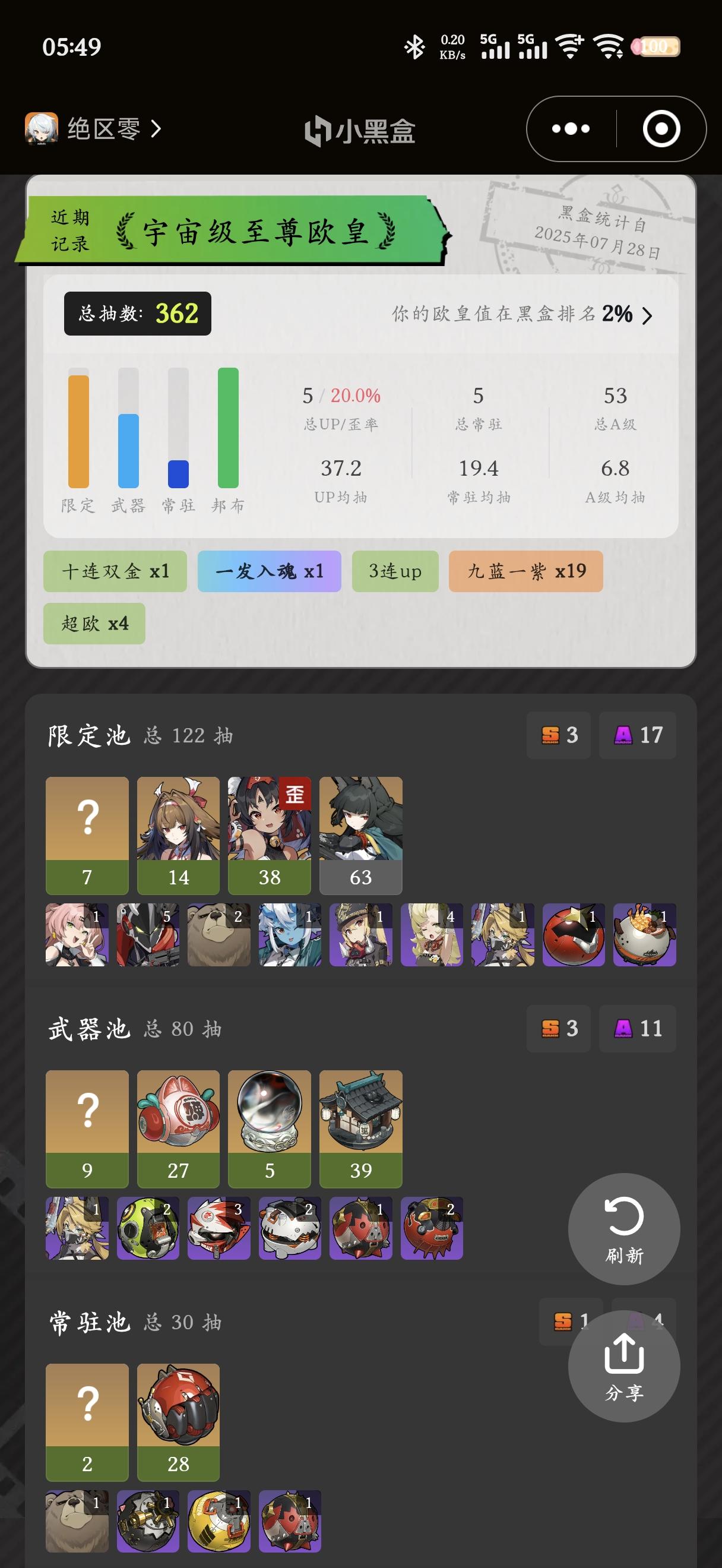 先问,图一图二这样哪个更好一点(我看是图二暴击率高一点……)再高就比较难了,就得好几个月积攒了另外就是图二四件套没凑起来的,是3+3折枝,所以还得调(如果要这样的话……)4号位爆伤对暴击率要求可能还是有点高,但是4号位主词条属于有就得硬上,双爆不可求啊……(刷了好几个月了才见过不超20个……而且大部分副词条还都是一坨)然后是第二个问题:如图三BOX,下半耀佳音还需不需要抽呢?(当然01雅