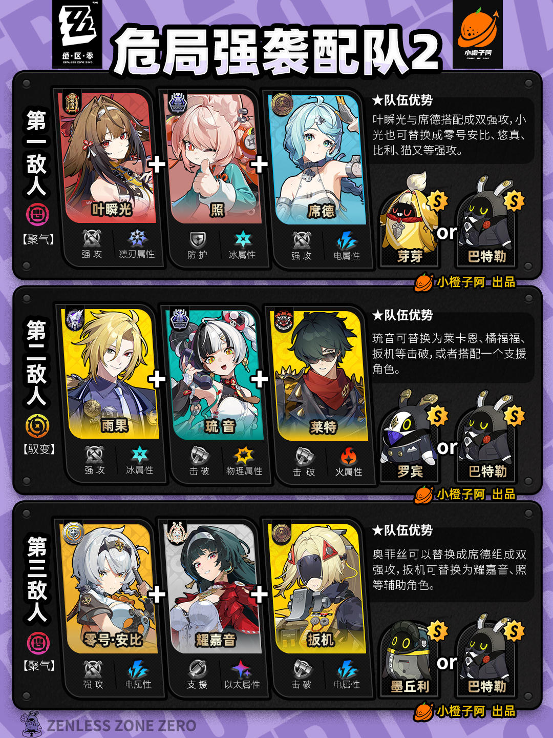 UID:15024695大家好,这里是小橙子阿。这一期是v2.5第二期危局强袭战配队搭配,小伙伴可根据橙子推荐的配队,然后搭配自身box进行灵活配队组合,跟多是保证小伙伴们能够都打满20000分拿满奖励。此次危局强袭,小光配队全都可解,小伙伴们可根据敌人选择适合的配队,最后再将小光配队按在无法匹配的敌人上。第一个敌人迎来了BOSS【亵渎者】是电与物理双弱点,【招架支援】成功获得增益,整体非
