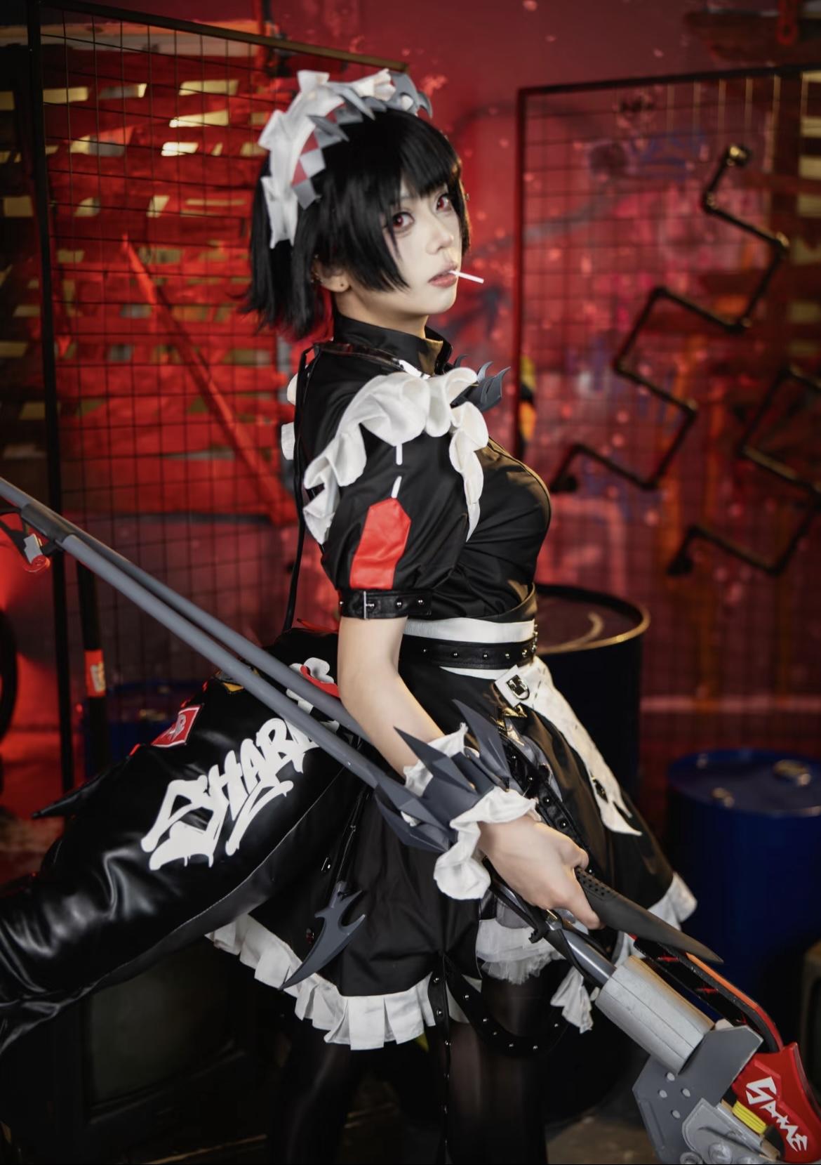这组艾莲乔cos的反差感与还原度直接拉满!利落的黑色短发搭配白色女仆头饰,尖刺装饰的细节精准复刻角色设定,瞬间勾勒出鲨鱼妹的飒爽与娇俏。妆容上,红调眼妆衬得眼眸凌厉又灵动,唇间咬着棒棒糖的小细节让角色多了几分俏皮,黑白女仆装的褶皱花边与皮质配饰碰撞出硬朗与柔美的融合感,红黑点缀的设计更是还原角色特征。坐在油桶上的姿态慵懒又桀骜,红黑网格与涂鸦的背景营造出都市街头的叛逆氛围,仿佛从《绝区零》的新艾利
