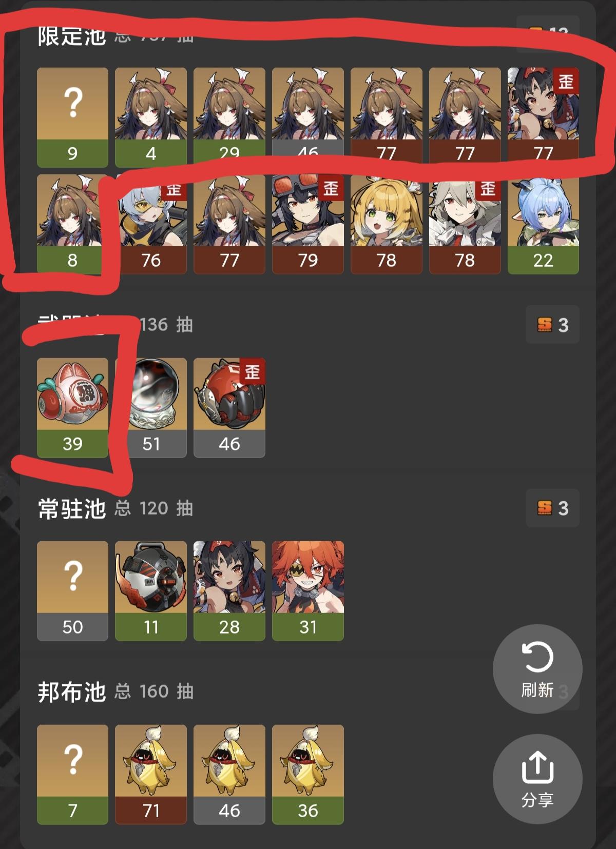 前段时间买了个号,21雅21仪玄01叶瞬光,看原号主签名是被次次大保底搞破防了。然后这几天我肝了些活动,清了清地图,加上氪了点,直接把叶抽满了,红圈圈出来的就是我抽的部分,运气还不错,特别是最后三个师姐。