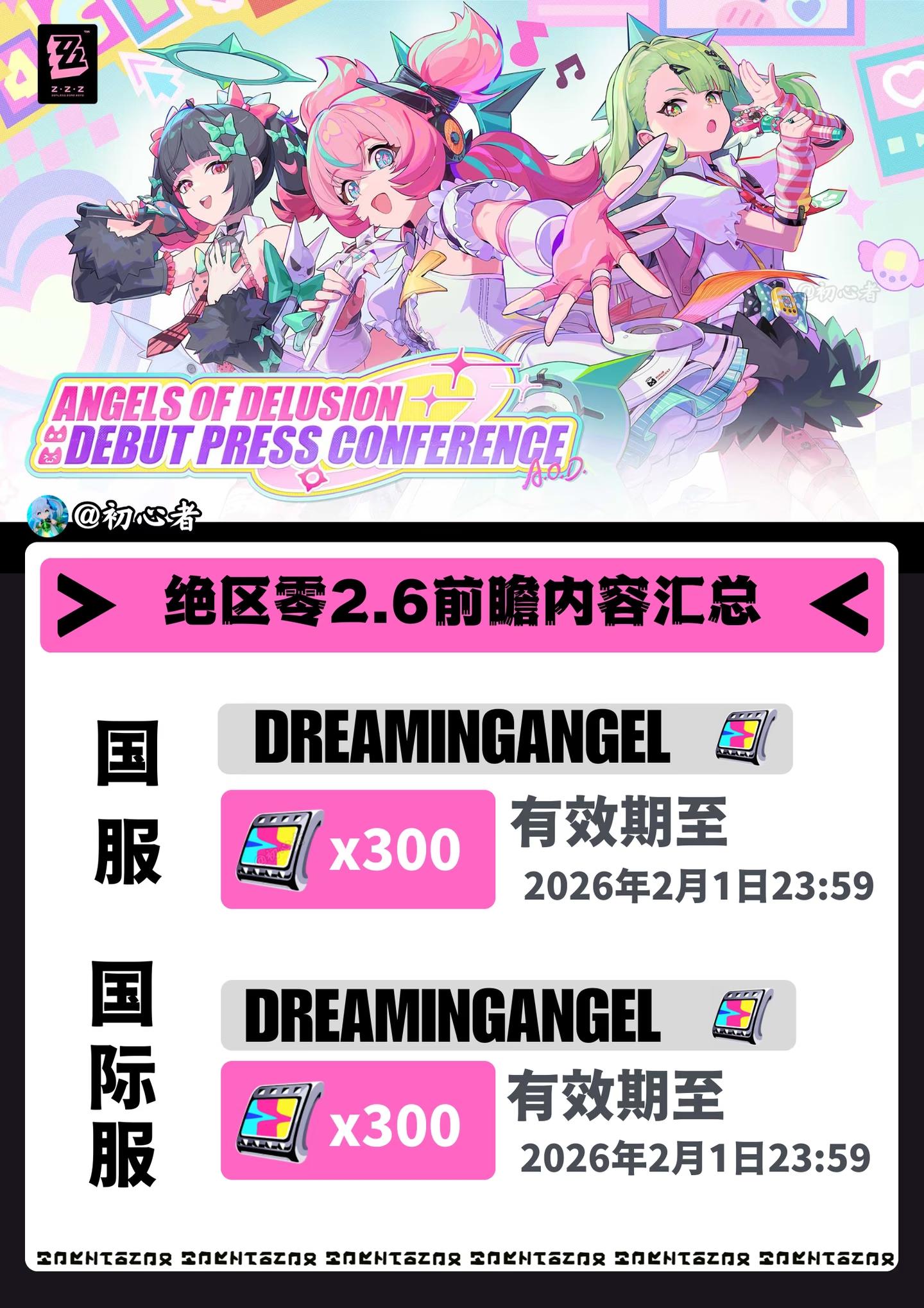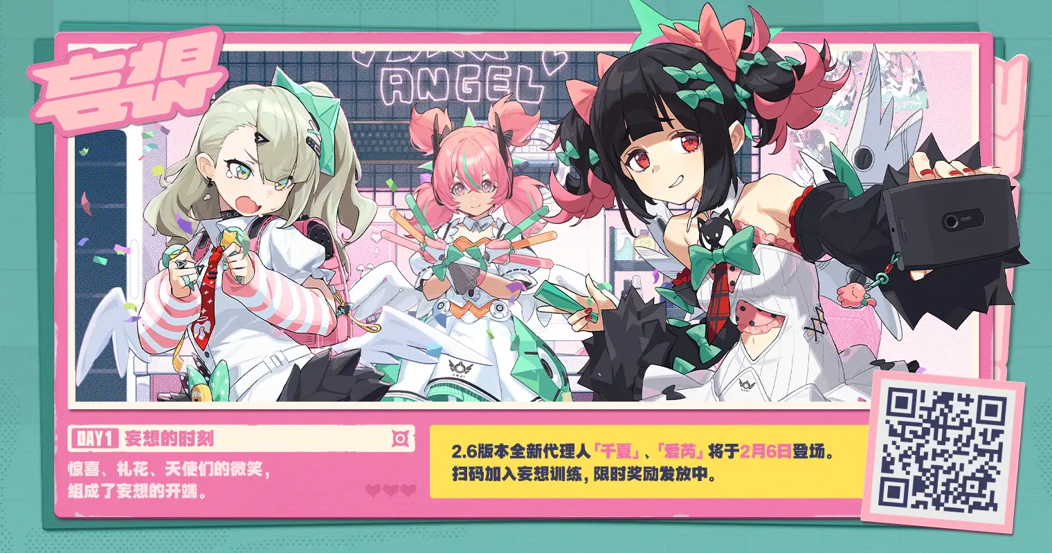 待昔年旧梦谢幕,再相约坠入拂晓的妄想。「妄想天使」即将如约而来,邀您一同完成关于爱与梦想的约定。S级代理人「千夏」&「爱芮」即将登场!更有代理人调频复刻、全新邦布、全新剧情和活动玩法将在2.6版本与绳匠见面,敬请期待! 本次特别节目中的兑换码将于2月1日 23:59:59失效,记得及时兑换哦~查看下方图片,回顾本次特别节目精彩内容!