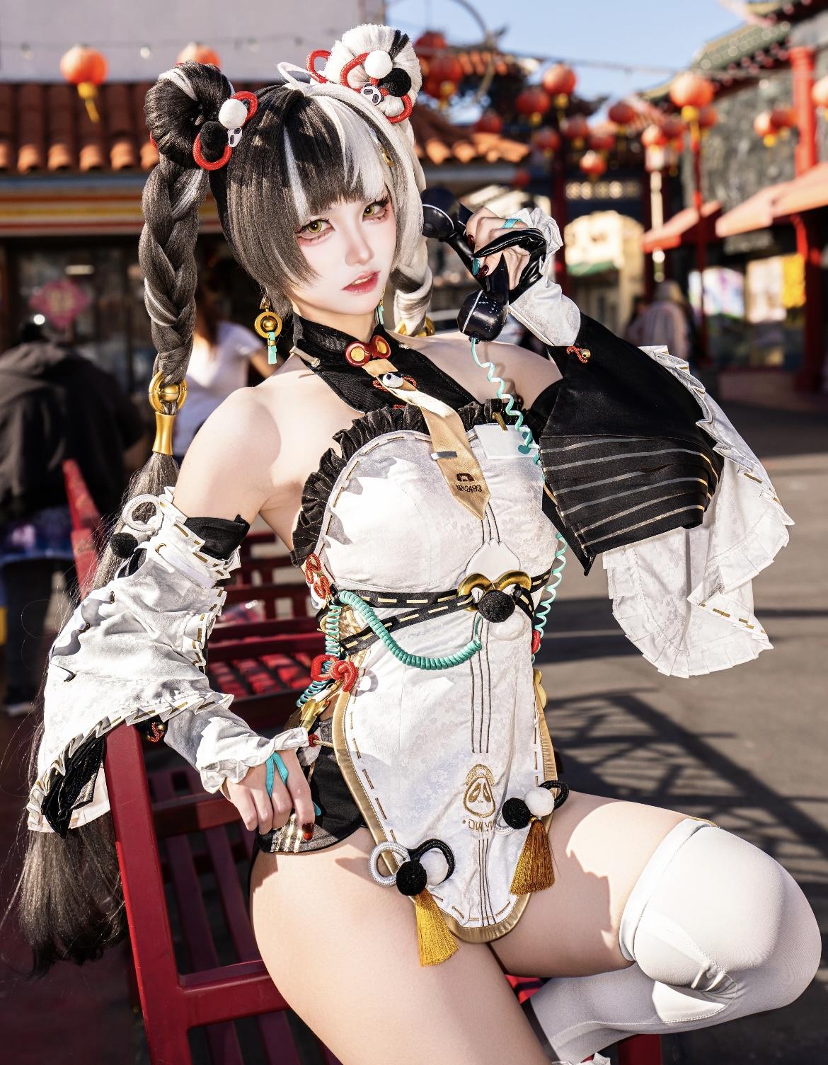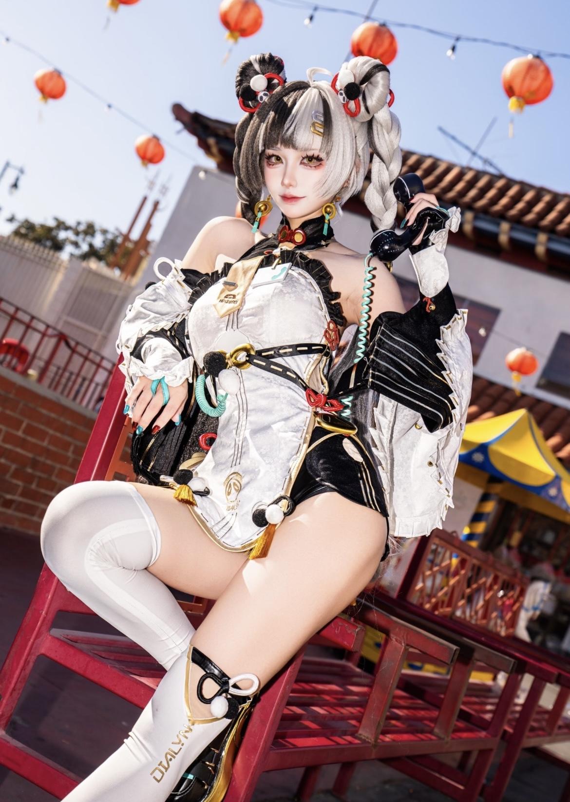 这组cos的还原度直接拉满!黑白渐变的双马尾编发蓬松又富有层次,发间的红白绒球与金色配饰精致亮眼,瞬间勾勒出角色的灵动与娇俏。妆容上,金调眼妆衬得眼眸明亮又带着几分狡黠,唇色的淡粉调与整体造型相呼应,将角色的少女感与飒爽融合得恰到好处。白黑为主的服饰剪裁极具国风巧思,褶皱花边与金属挂饰细节满满,腰间的彩色绳结与流苏添了几分活泼,白色护膝与服饰的硬朗线条形成反差萌。倚靠在红椅上的姿态慵懒又嚣张,背景