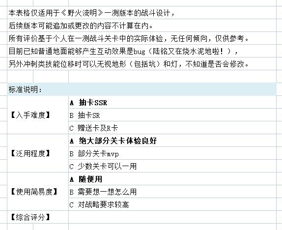 给亲友看的,写都写了发一下好了…… 注意:个人想法仅供参考!以及这张表格仅适用于《野火流明》一测版本,后续一切更新或改动以官方设计为准。 如有不同思路或意见,请和平交流~ 希望以后的战斗设计可以更多体现回血/解弱化的作用,不然真的不想塞奶妈进去…… (小猫的l2d真的好好看啊!!!!!!!)#攻略#游戏讨论