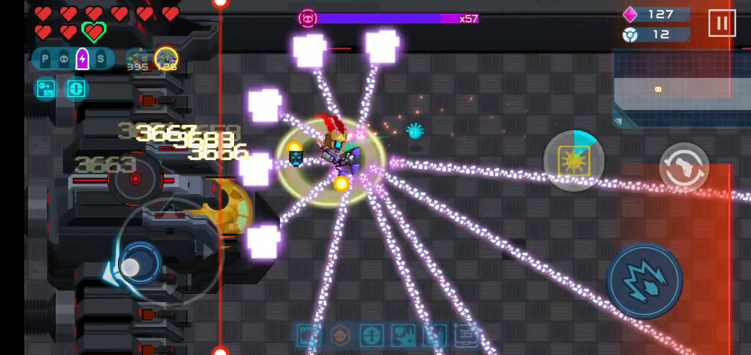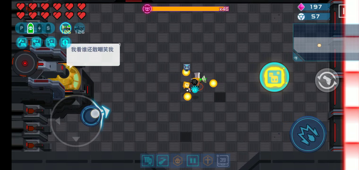 分裂细胞枪+子弹抵消敌对子弹+主动技能反弹护盾=无敌 本来是有💛的,但是因为天赋多了个先扣❤的,所以挨到子弹被打掉了一颗