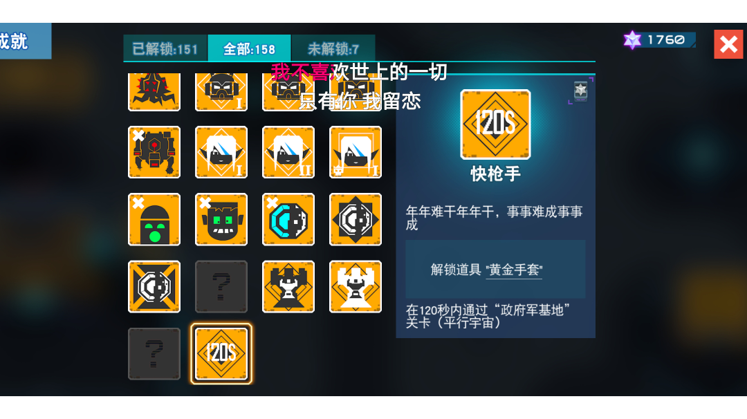 最近在刷成就,刚刷完所有角色通关平行宇宙和末日全明星,就试一下【快抢手】刚好第一局就遇到脉冲,刚好120秒。哈哈😄。之前不知道哪个是政府军基地,还以为是飞船或者是沙漠里那个,我就说怎么刷了那么多次都没完成,还特地录屏算时间,没到120秒。