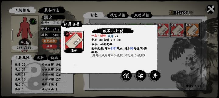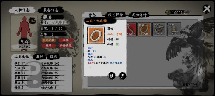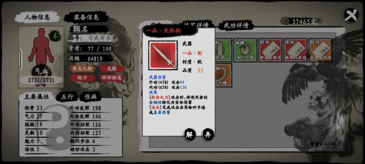 刚入游戏难免有些迷茫,在此做一个简易攻略引导方向首先,简单介绍一下游戏的一些性质物品品级由低到高分别为7品(灰色)6品(绿色)5品(蓝色)4品(紫色)3品(粉色)2品(橙色)1品(红色)人物基础属性分为气血(HP)外功(物伤)内功(法伤)外防(物防)内防(法抗)以下为其他属性对基础属性加成五行相生相克,可以在游戏内查,前期不相克就行,后期往混沌发展(所有五行属性相差不到10%为混沌