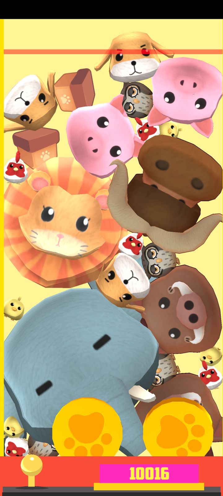 调整落点砸落小动物,成对[触碰]合成大动物,间隔刷盒子需通过连击获得炸弹来消除。