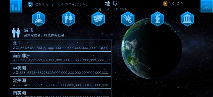 挂了一年多的星球,人口多的已经干脆不显示了,已经爆表了。可以看到东亚和南亚地区的人口已经被标上了infinity无限,其余城市的人口数几乎都要超出边框,位数已经数不清了。我估计再过几天其他城市的人口数也会变成无限。#游戏讨论 #游戏日常 #单机游戏
