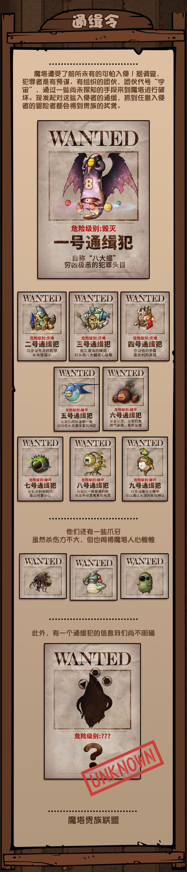 来自宇宙的不速之客们似乎没有“规矩”的概念,他们的捣乱让贵族苦恼了好一阵子,以至于悬赏金已经达到了魔塔有史以来的最高水平!对冒险者而言,这可是一个重要信号——是时候出手了!不过盯着这笔赏金的冒险者可不止一位,想要拿到高额的悬赏,还得先人一步,抢先找到这些怪物才行。所以,各位冒险者们,为了悬赏,抓紧时间前往魔塔吧~※活动规则:请在本贴中回复与以下通缉令中怪物战斗的完整截图,每个怪物都可以回复一次
