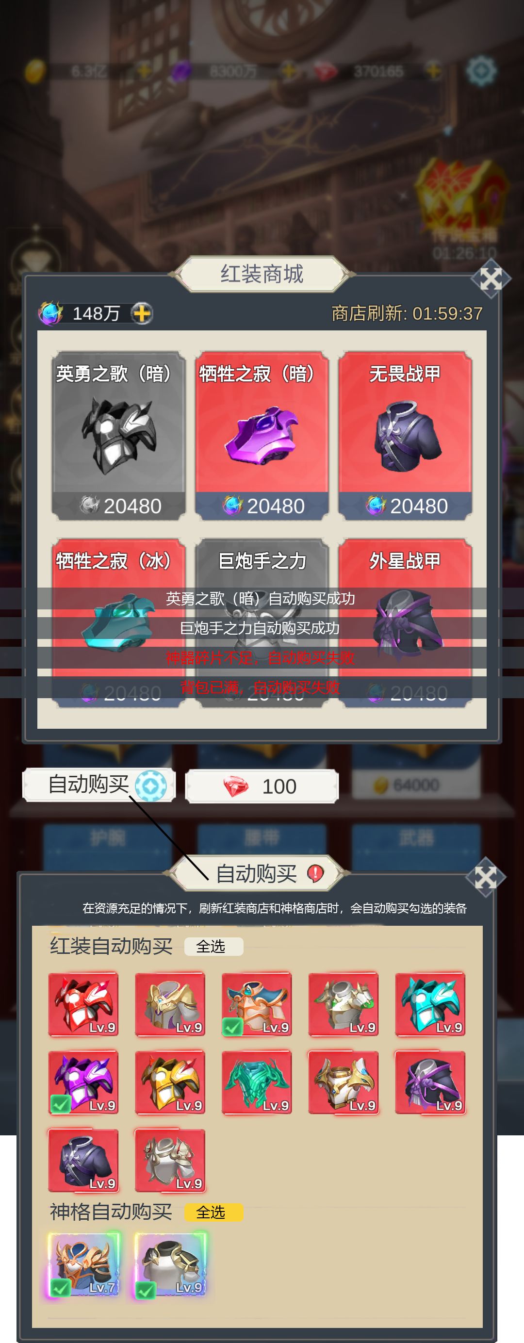 红装商店,购买的弹框时间太长。 神器碎片太多的情况购买的时候很长很麻烦,可以设置一个自动购买吗。 选定想要的红装,收送刷新出来的时候,自动购买,这样就可以节省很多时间。 宠物商店和神格商店也可以。
