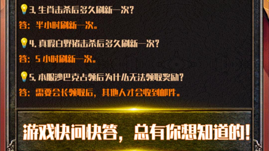 #宝藏游戏安利派对 💡1. 如何取下身上穿戴的装备? 答:双击想取下的装备即可。 💡2. 限时活动里的真假白野猪怎么找不到了? 答:真假白野猪改为常驻活动了,在主城左边,BOSS 之家上面,39 转的小伙伴可以去挑战。 💡3. 生肖击杀后多久刷新一次? 答:半小时刷新一次。 💡4. 真假白野猪击杀后多久刷新一次? 答:5 小时刷新一次。 💡5. 本服沙巴克占领后为什么无法领取奖励? 答:需要会长