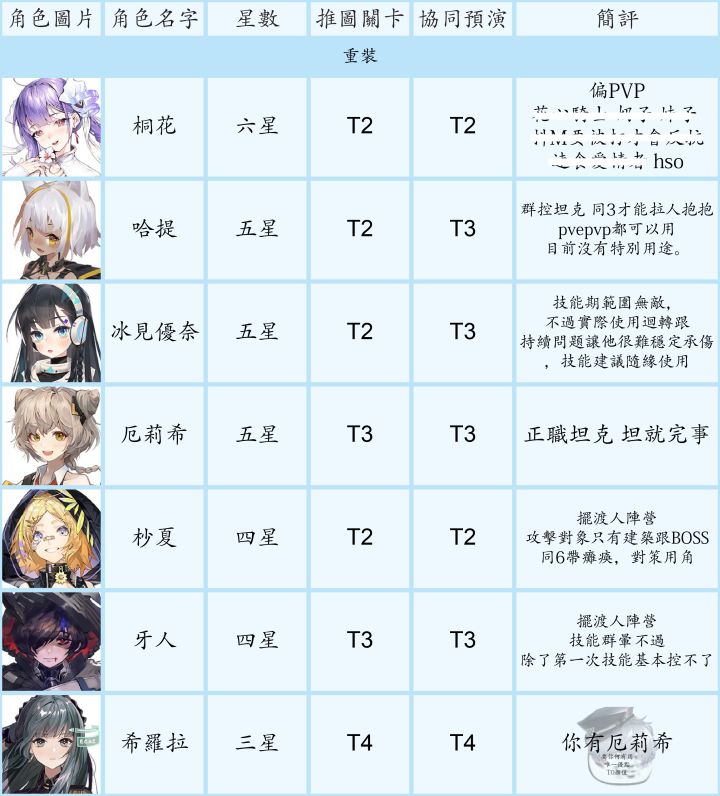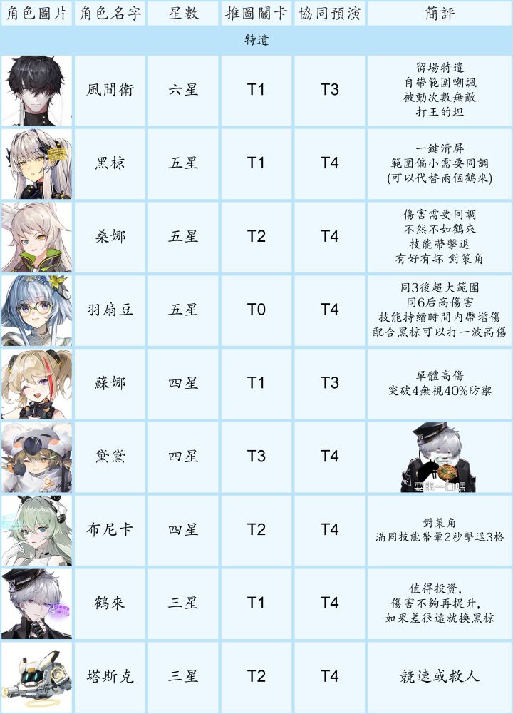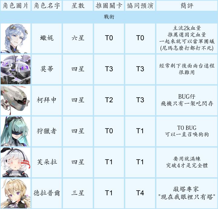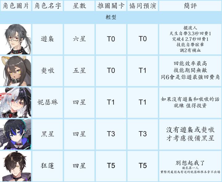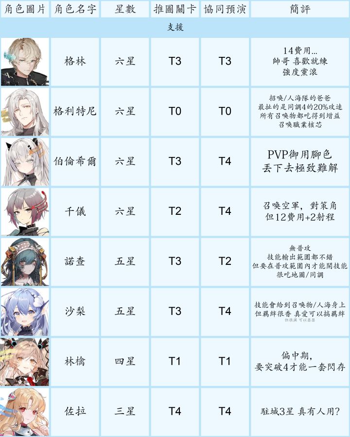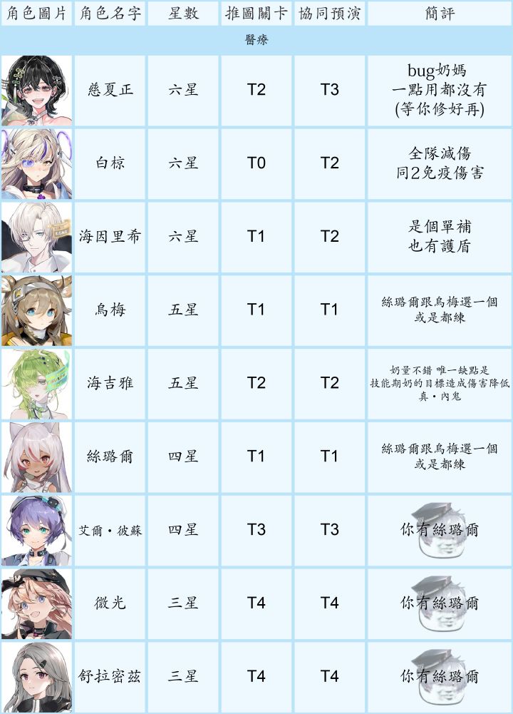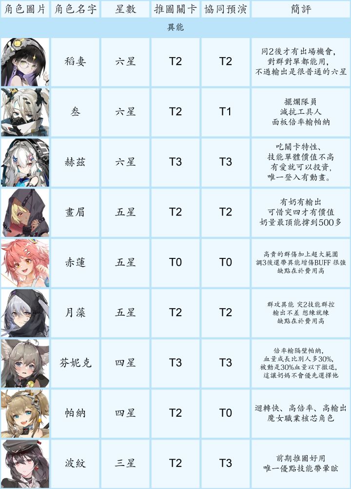 节奏榜大家都有个人见解,初衷只是给不熟悉游戏的新手一个养成和抽卡的思路。1. 讨论范围- 主要考量的使用范围是主线、资源关卡、协同预演(每日boss)、巡维(技能升级材料)、闪存集测(肉鸽玩法)- PVP不在考量内,再不济有免费角色可用- 6星以同调0-1考量强度、5星以同调0-2、4星满同调考量- 某些职业要练度很高才能体现出众价值,或者目前个人感觉队伍中地位可有可无,例如群攻类强袭,