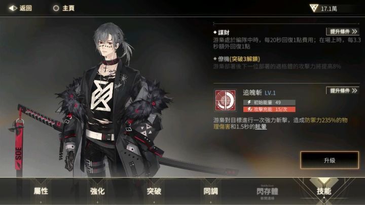 4.人物进阶需要同名角色,升到最高需要5个本体,稀有度最高是六星,进阶强化属性和技能,技能弱仅