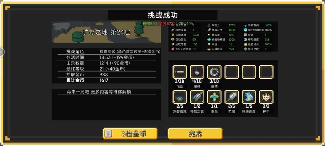 这关目前我有两种思路过关。①第一种:就是主修飞剑拼人品,飞剑-0.5秒CD吃到大概5个/6个以后就可以实现零CD无限飞剑,飞剑是所有成型最快的一个,但完全看运气,可能坚持不到就凉了。 ②第二种:就是跑酷流,前期先发育一会儿,拿闪电鞭,毒圈,炸弹,冲击波这种随身移动的,方便跑路,主修闪避和移速等保命技能,点满的话接近50%的闪避几率,当清不掉怪的时候(一般是第一个boss出现的时候)就开始跑。 注
