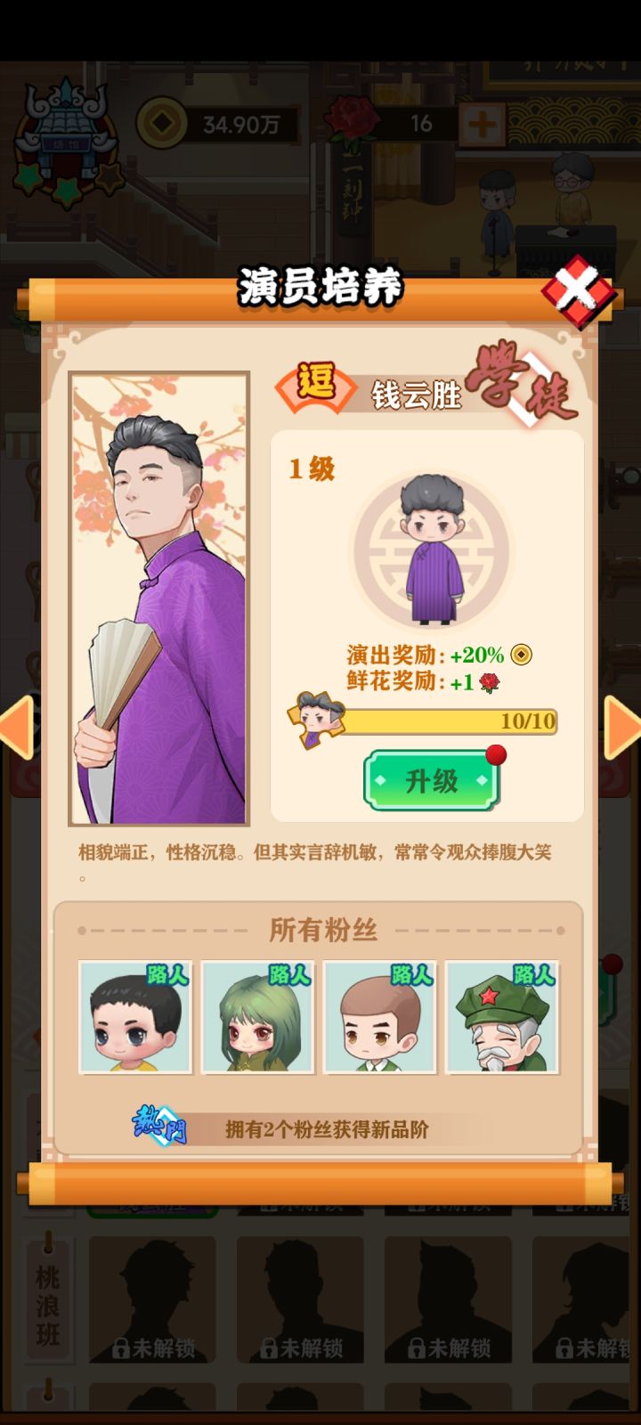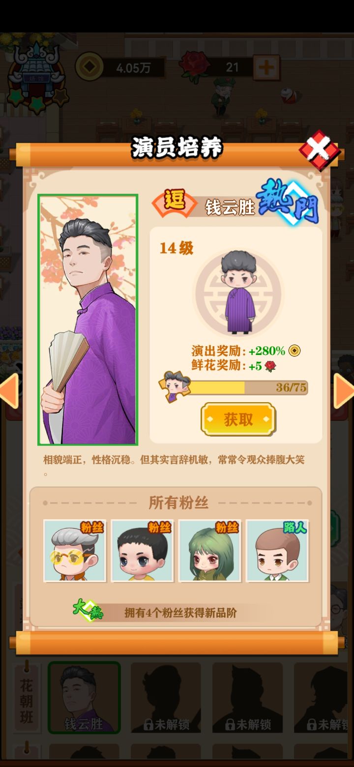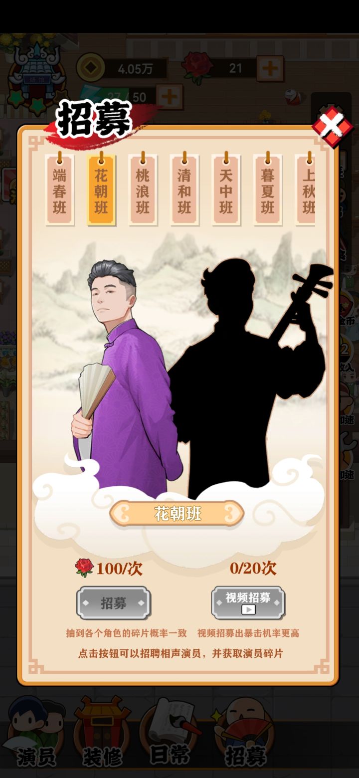 这游戏还没做完吧,花朝班就这一人吧,20次广告都抽完了,钱云胜都14级了,第二个人连个碎片都没有