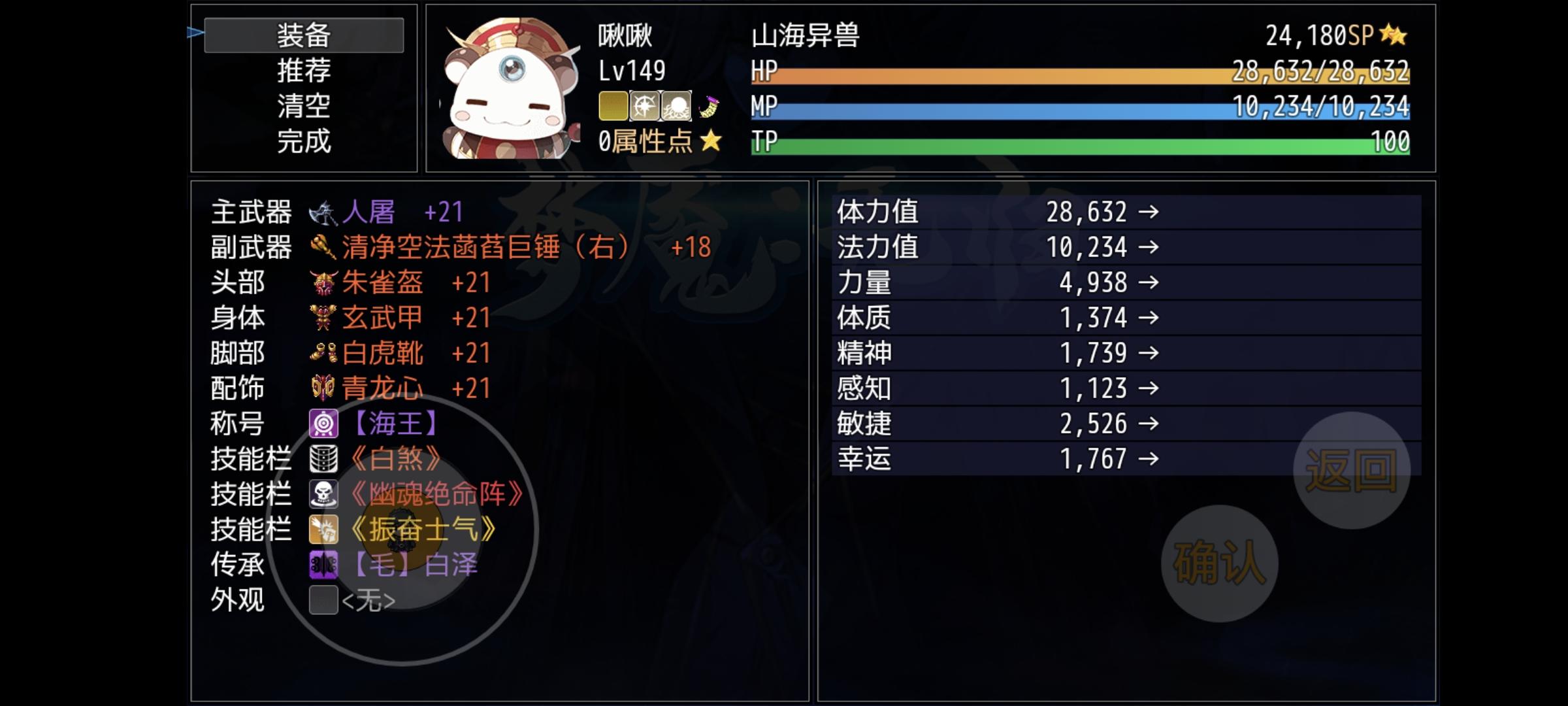 角色定位开局选打工人(+10体质,*1.05%经验)和体质特长(减伤+回血+复活),团队最坚实的护盾;樱天选之子主精神副力量其他属性也有伤害加成,妥妥的第一输出;岳父主力量团队第二输出;猫主敏捷速度快,前期担任第二输出后期主控制、给boss上减益。角色养成体主:装备上:最终目标是若水套(前期过完第一幕可以幻化执法者在空间找执法者们买无坚不摧之力,副手用渡鸦盾,再换壁垒,其他的就看体质高的跟