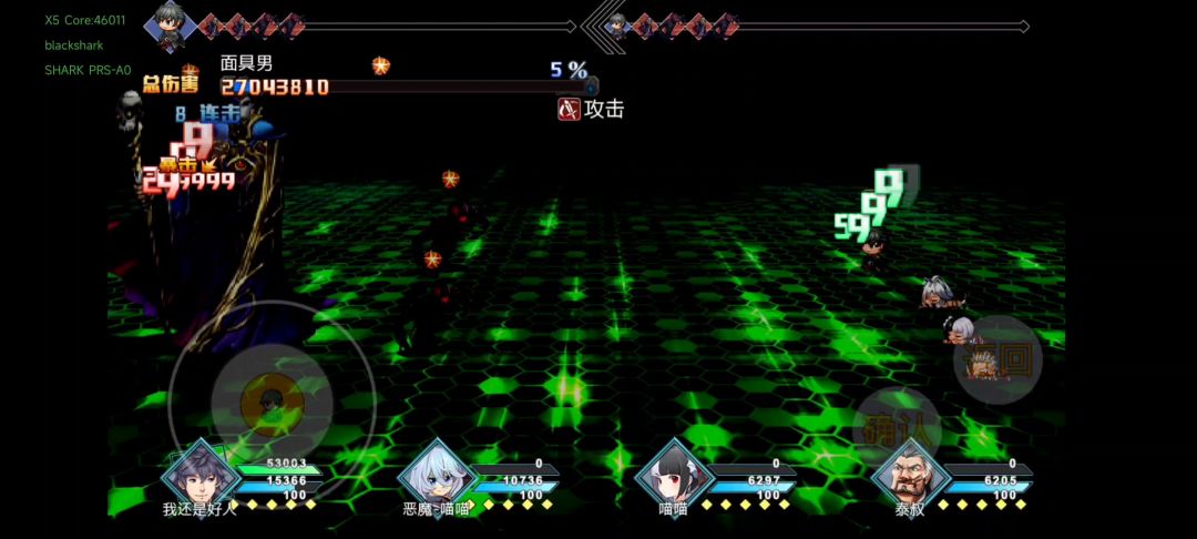 屯了两周目的药,53000血,9100敏捷,一周目除了7根针其他属性药都被我吃了,二周目钓鱼商店也没买完,无限刻印被吞了,所以这不是极限属性,不过因为伤害有上限,所以那点属性无关紧要。主要输出手段:敏主被动,敏捷传承,诸葛连弩/火尖枪(攻击次数是会一直累计的,满三次就有额外伤害),保命手段:紫武+精神传承的伤害转化盾,打一次29w给6w盾,每回合30-40多万的盾,面具男每回合最多打三十多万,必定能抗住