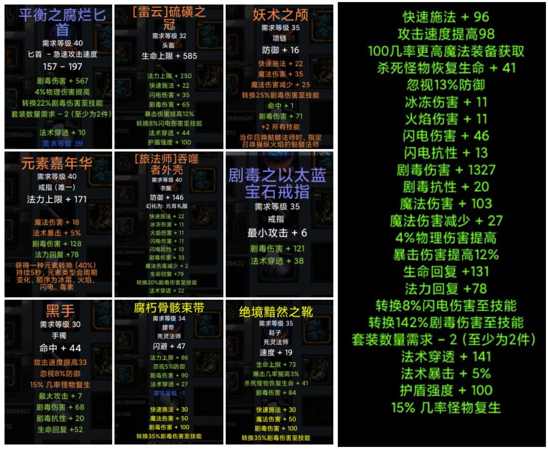 匕首没时间去赌+2死灵技能,将就弄个-3的匕首合了个高毒的。 头盔用硫磺头,退化词条留施法,毒伤,爆伤,法穿,有抗性或杀回血/蓝更佳! 项链合高毒妖术之语,可以洗+2技能/秘银护盾赋予 戒指常规的高毒嘉年华,另一个戒指带高毒,看面板补属性,我这里补的法穿。 衣服吞噬者外壳带毒转多词条的,留施法,法穿,毒转,有抗性更佳! 手镯用高毒黑手,复活的怪瞬间炸死。 腰带死灵套合高毒+穿有毒转更佳。 靴子高毒
