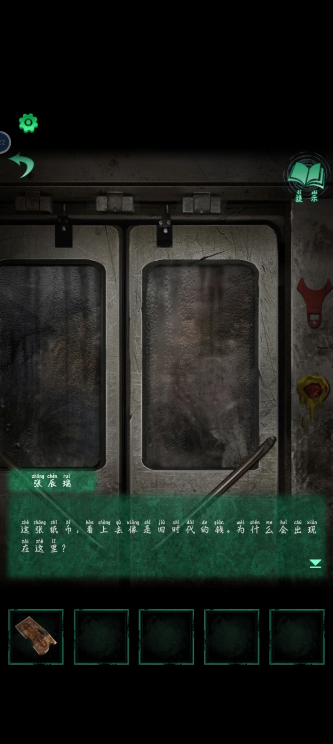 过剧情(注意高能) 第一章(张 视角) 1.点击车门,获得[民国纸币] 点击钱箱,投入[民国纸币],获得女纸人手中盒子的密码[缢倀□焦娚颤] 打开盒子,纸人手指按公告牌上提示顺序 获得[高跟鞋]和[蜡烛] 用[高跟鞋]敲击车窗,从车窗下车 向右 获得[扫把] 点击大门,用扫把获得门外纸条,得行李箱密码[0819] 车门应急阀打开车门回车上 打开行李箱获得 车灯开关 [上中上下下上] 获得[红圆珠笔