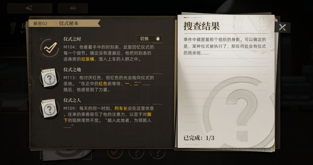 该解密用任意探员均可完成 (注意⚠️要成功通关关卡并收到左侧获得线索的提示才算收集成功哦,获得线索后直接退出关卡是不能成功收集的[表情_豹哭]) M104关卡:将任意探员移动到图中蓝色垃圾桶旁边即可。(ps另一边的红色垃圾桶是不行的哦,那边没地铁不能混入人群[表情_微笑]) M113关卡:将探员移动到中间信号灯前,等待第二波怪刷新即可。(这里不确定一、二说的是怪的波数还是说信号灯变红的第二回合,感