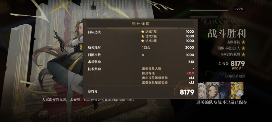 练度是全70,每个角色双技能三级,电光5级,心锚首发狙30,其余平均三个全蓝+10,(电视机50级白板) 如果要抄作业注意电光和奶的走位要非常精准,差一点狙都要打死电光,或者狙跑到别地方打你