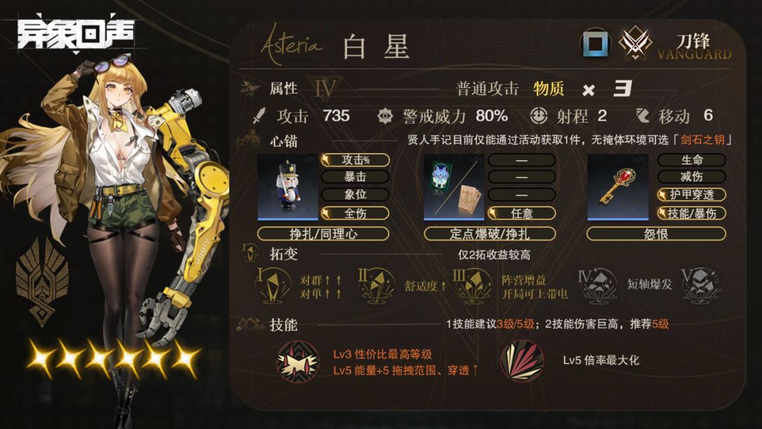 借用一下论坛内大佬的伤害数据测评,原贴在此(好像手机没法做超链接):异象回声:安妮塔先遣评测报告!这焦热6星狙真有传言这般无力么 https://www.taptap.cn/moment/611138720698991088?share_id=9dc28be845ca&utm_medium=share&utm_source=copylink 省流版:猴戏角色,吃特定阵容和地图,通用性较差。 标签: