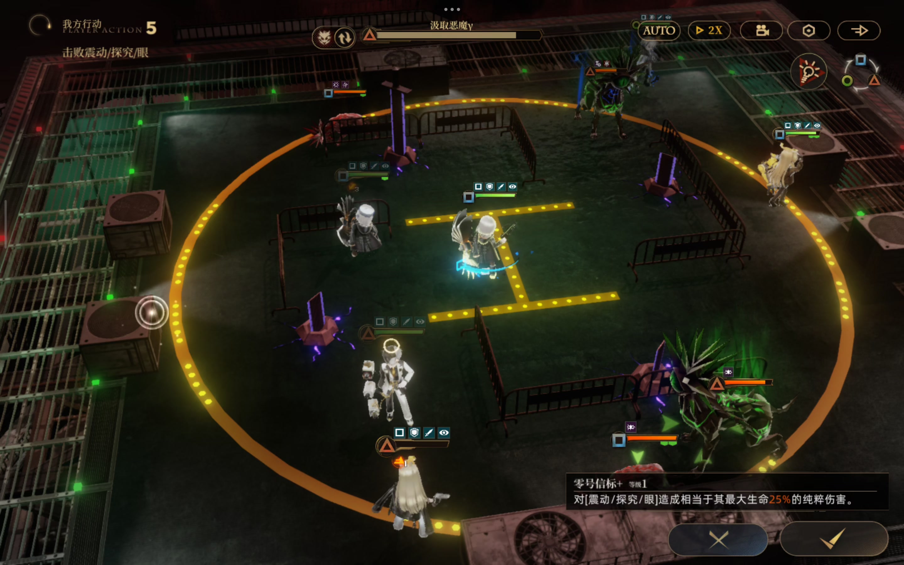 只带装备1。来看看有多牢 要点: 1.站好掩体,站位集中一点,分摊地刺伤害 2.两回合集火小boss。伊德可以提供两回合带电,击杀小怪后下次普攻带电,以及下一回合用一技能 3.警戒清杂兵。地图自带的夜刃也能警戒