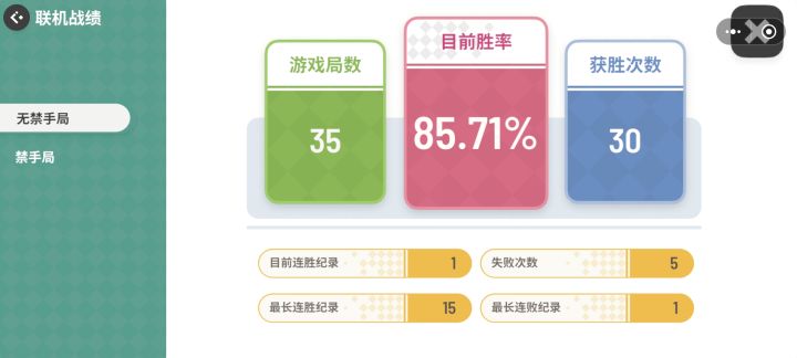 无禁手还是比较好玩的,我喜欢无禁手用白棋堵人感觉很有意思,不知道是不是给我匹配的人机到现在还没发现很厉害的,就输了5局,两局还是我快赢了我看对面一直发那个蓝色表情就让给对面赢了