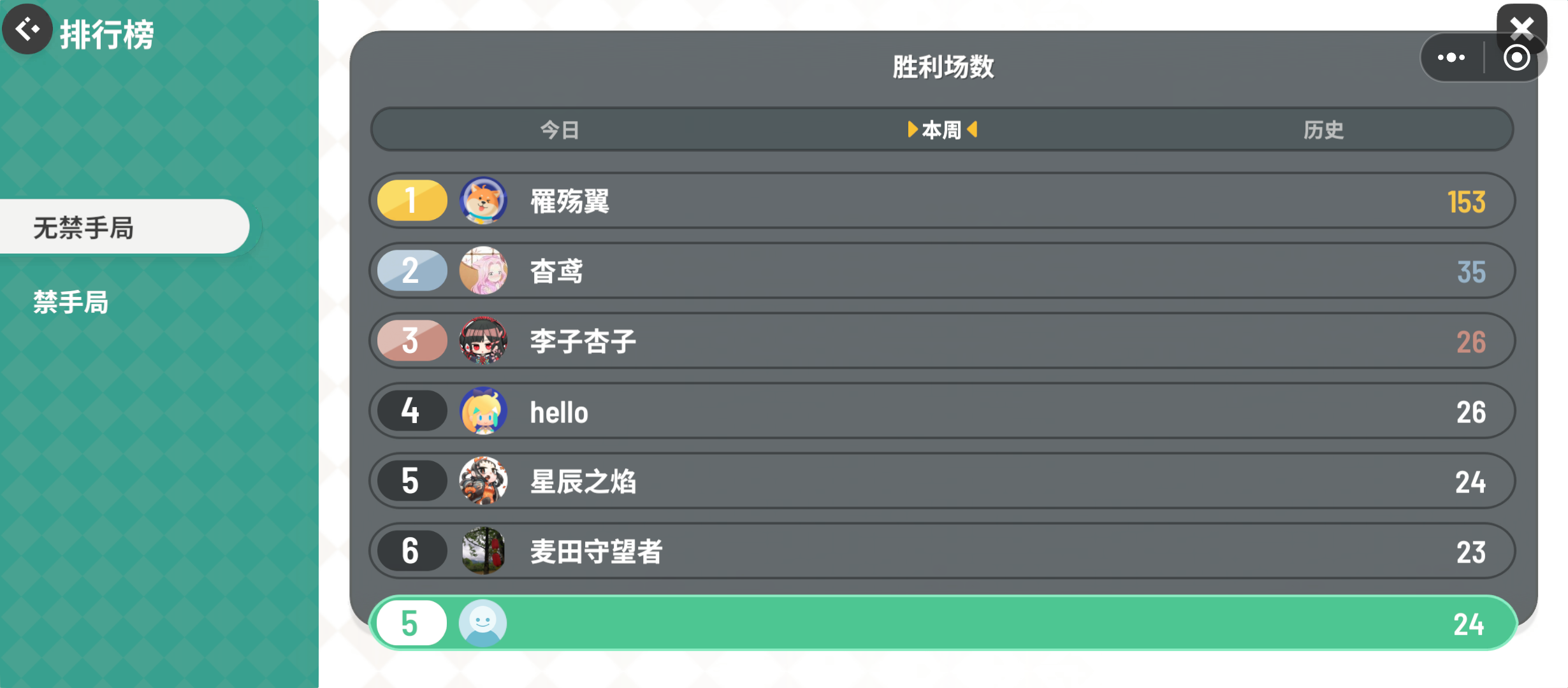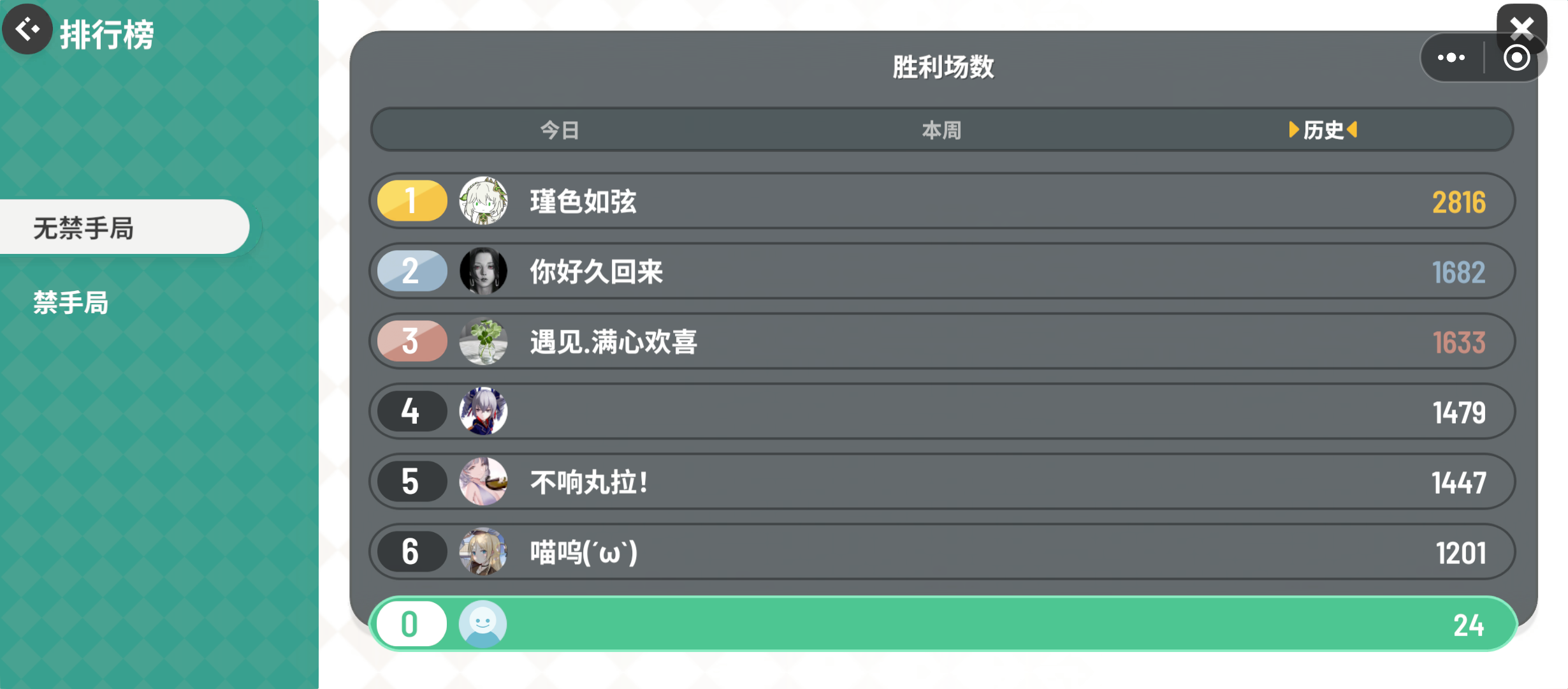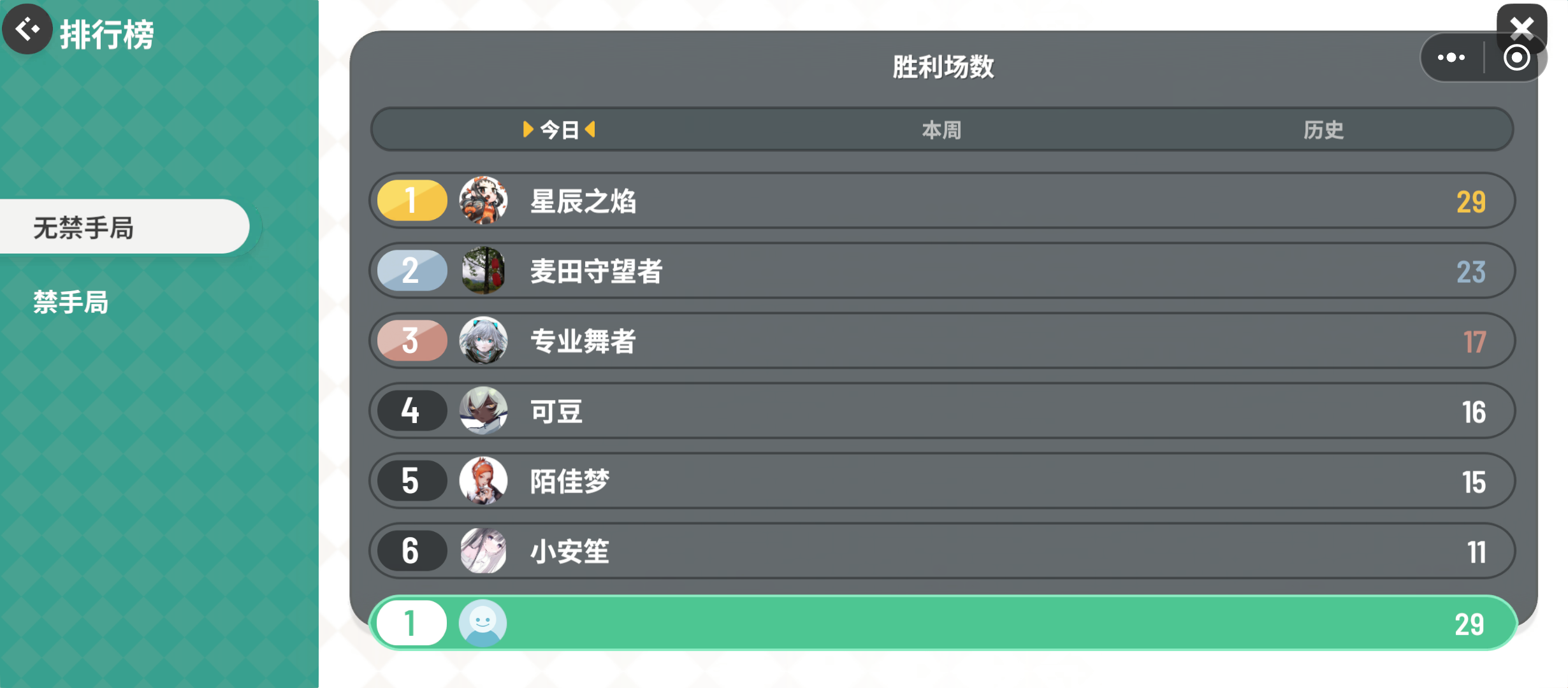 今日胜场数到第一后突然不统计了,赢了两三场都没记进去,然后我重登了三次又开始计数了,但本周胜场数又不同步了,历史胜场数明显也不对劲,这排行榜是不是不对劲😂
