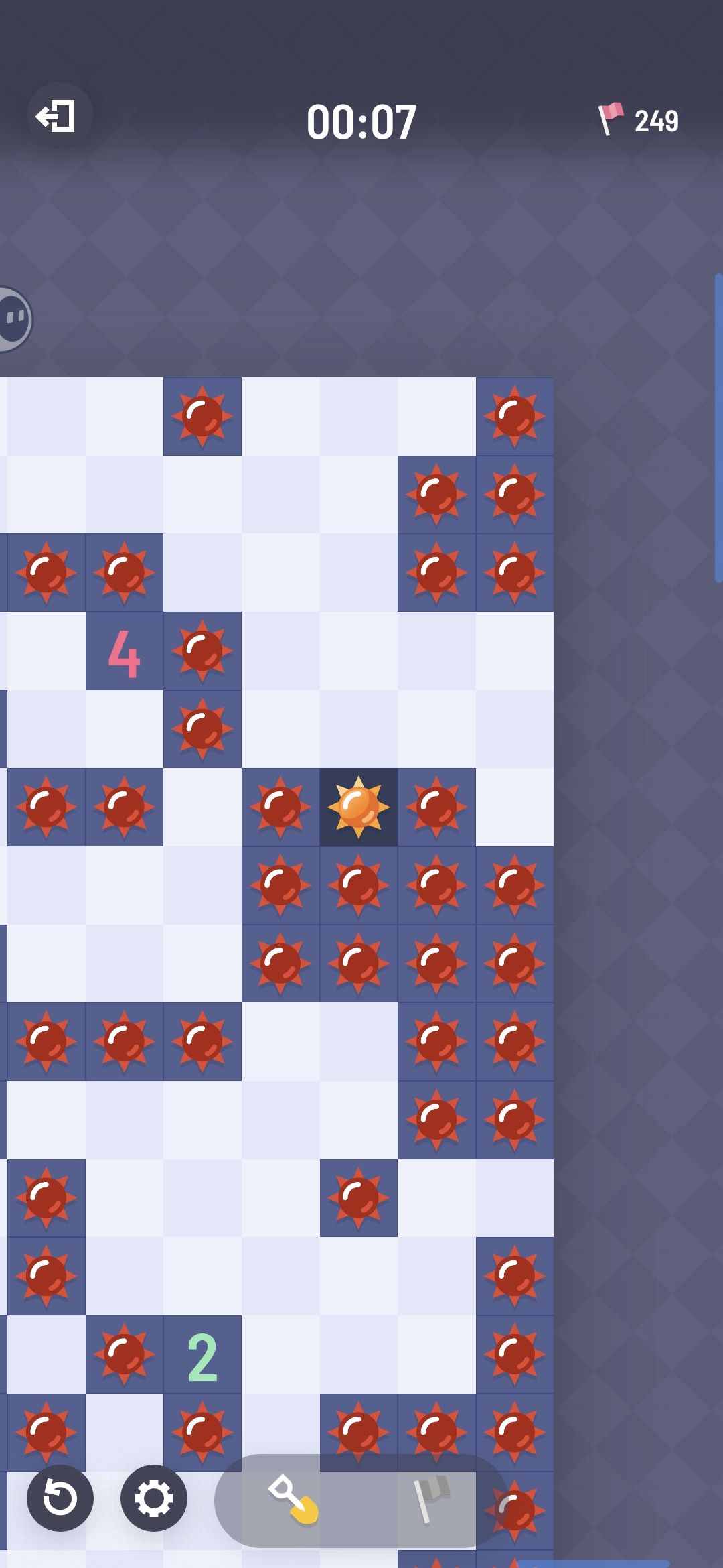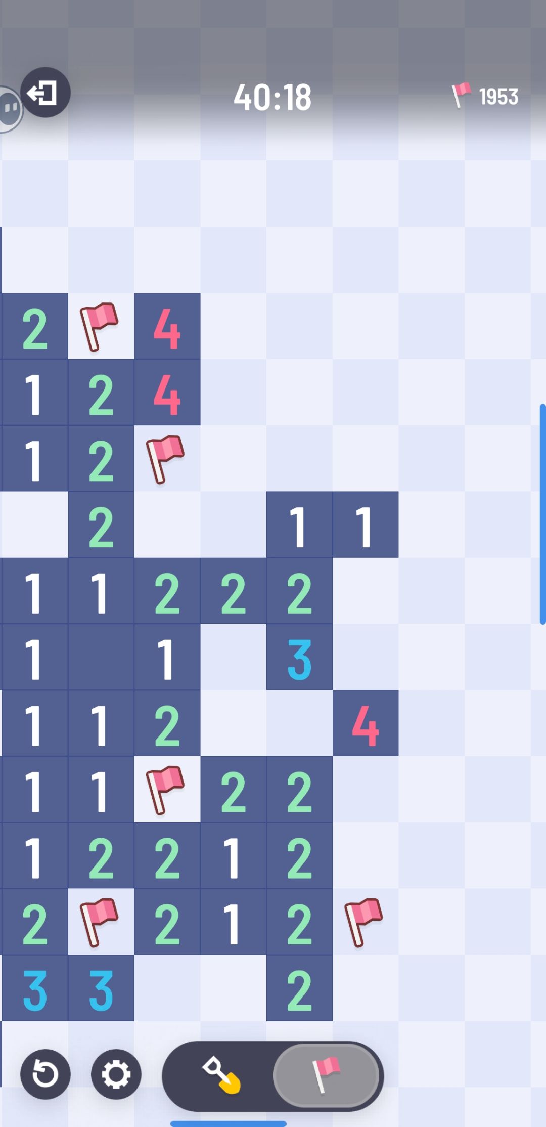 这件事不是第一次碰到了,由于tap论坛发帖交流本身不是很方便,不能做到像QQ群那样及时交流,导致有一些玩家的提问因为不发全图而很有迷惑性(当然这不是玩家故意的,玩家可能不了解发全图的重要性)。 举例子吧,让我们来看下面这张图: 你可能会看出来,这图有问题啊!剩余雷数是2,4旁边三格中有一个雷了,那剩下一个雷在哪?可能就在剩下五格里吧?那这样就没有100%非雷格子啊,难道说这个游戏要猜?还叫无猜扫雷
