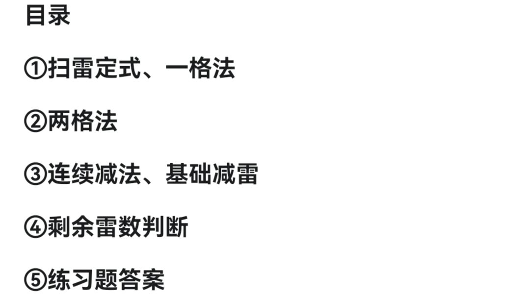 本帖子是帮新手快速入门扫雷,每个扫雷技巧结束都有练习题,[表情_可爱]练习题要自己做 目录 ①扫雷定式、一格法 ②两格法 ③连续减法、基础减雷 ④剩余雷数判断 ⑤练习题答案 分割线 -------------------------------------------- ①扫雷定式、一格法 定式就是固定的样子,定式知道之后,看数字一眼就能判断。知道定式结果没有用,如果看不懂定式的过程,就好像知道