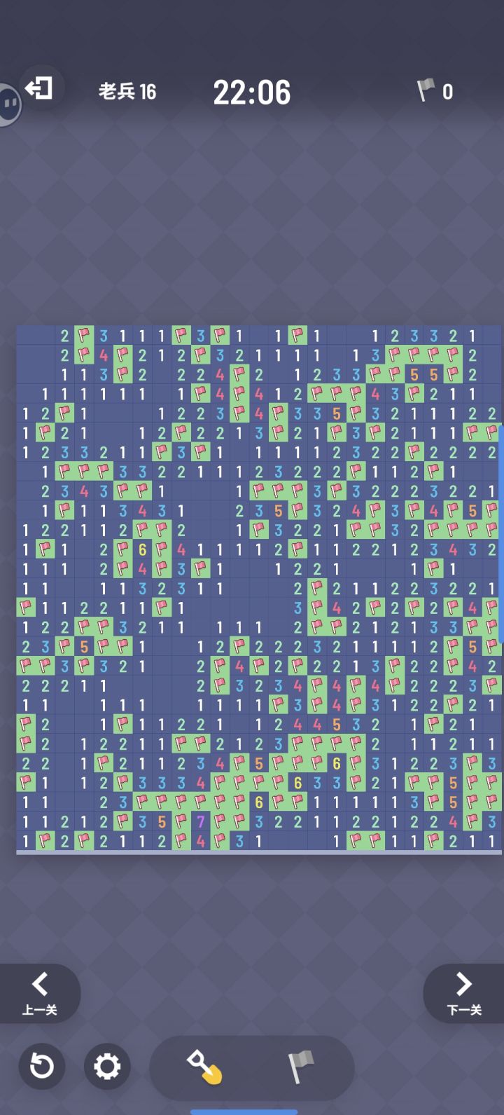 纪念一下,打到这里感觉好累啊,推理到一半会卡住,我必须通过假设看哪些地方是安全的,排除掉,再找出雷在哪,其实也算是有点熟练了,但是太累了经常犯点低级错误,比如分不清长短按,插旗插歪了导致重开了两三局😂