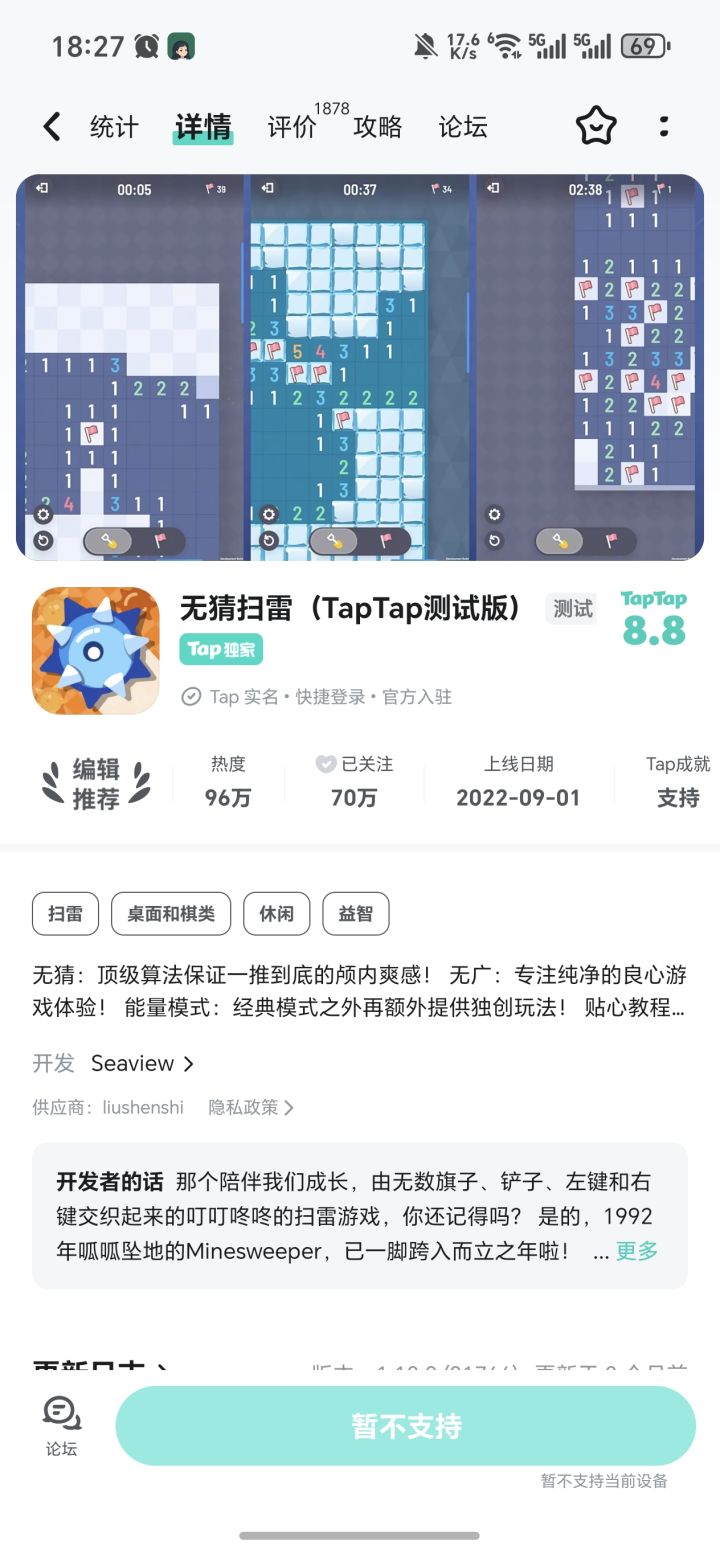 如图换了新手机之后这个扫雷就打不开了。网上找了安装包1.21版本的下载,结果打开提示我要去tap下载最新版本,但是这个tap直接显示不支持我好想把这个全成就完成就差一点点了