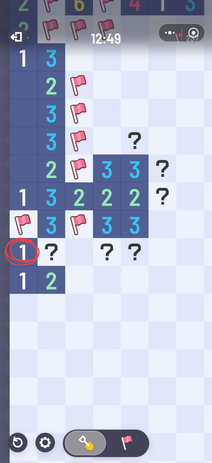 我先点的是圈起来的那个1,认为它是安全的,没给它问号,可是这个1又让旁边的问号起冲突,后面点空白的直接给我炸死了,可是没点之前,我自己也推了,觉得没有问题,玩的是无猜,不是有唯一性吗,问啥会有炸,不理解