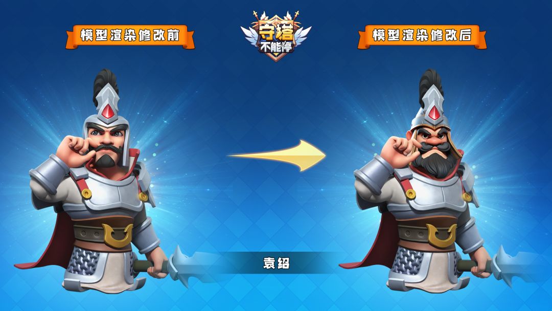 亲爱的召唤师大人们,大家好! 《守塔不能停》在后续版本即将迎来一波大的更新。 在未来的新版本中,项目组为众多英雄角色进行了重新设计。 希望这波形象升级能为大家带来更好的视觉体验。 那么都有哪些变化呢?就让我们一起来先睹为快吧! 蓝将: 本次对袁绍的形象改变主要体现在气质上,袁绍此人虽然是名动天下的一方霸主,但好谋无断、气量狭隘。所以新形象对袁绍的面部有较大改动,虽然看起来满面虬髯似乎十分威武,但从