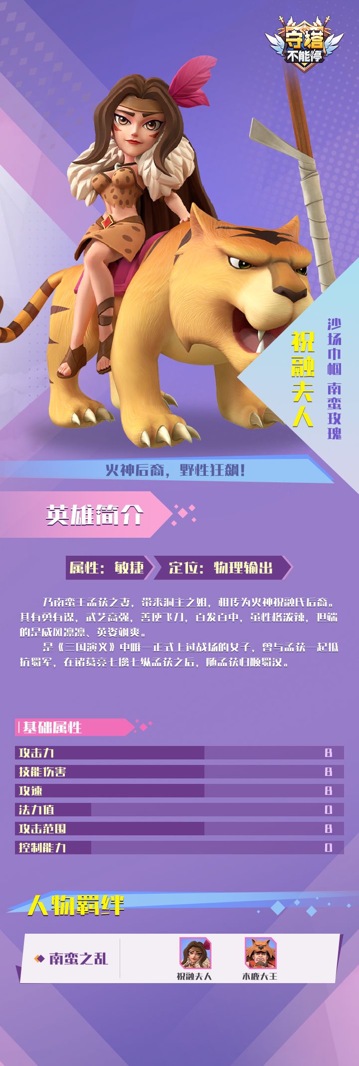 亲爱的小伙伴们: 今天带来英雄「祝融夫人」详情介绍: 技能展示: 攻击时对多个敌人造成额外伤害并附带持续流血伤害。