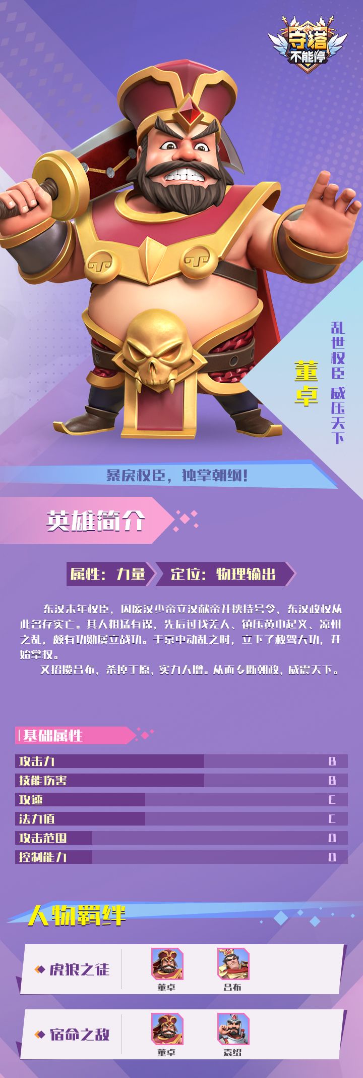 亲爱的小伙伴们: 今天带来英雄「董卓」详情介绍: 技能展示: 蓄力后对范围内所有敌人造成多段物理伤害。