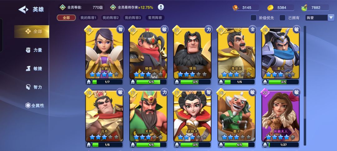 OK,先介绍一下我通关的质量。 主c韩信李世民副c项羽都是3阶,学识点到了25级,召唤为主力量敏捷为辅。最终伤害加成为12.75%,紫卡平均等级在17左右,金卡主力20➕,宠物符文120攻击力➕0.85%召唤物攻击力。 这个属性整体已经超过过8的条件,因为可以挺轻松度过30波。 距离通7大约有20天,此间错过不少活动并且处于摸鱼状态并未去刻意刷经验以及金币,所以阵容质量偏差。 具体流程如下,文字叙