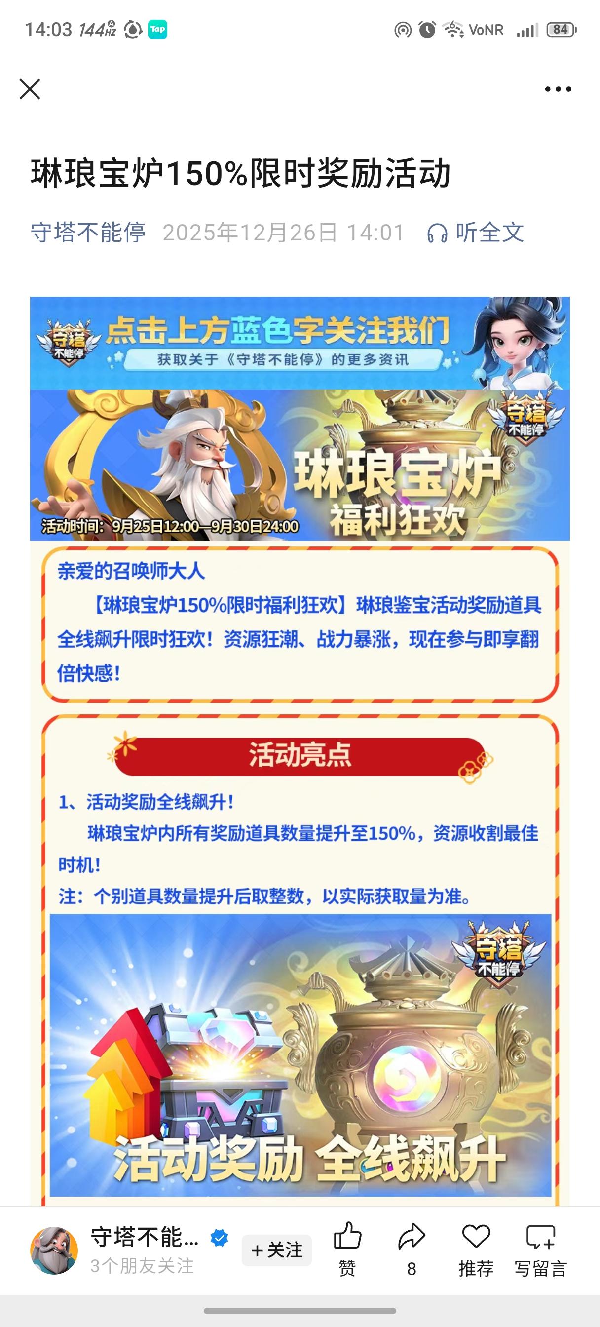 缤纷圣诞,尽享快乐时光,收获福利满满! 亲爱的召唤师大人,是时候为你们送上那份特别的惊喜与温暖了! 作为您忠实的伙伴,《守塔不能停》也为您准备了一份惊喜福利,为您的新征程加油助力! 每一份福利,都凝聚着我们对您的喜爱与感激,希望它们能陪伴你们在游戏中度过一个愉快的时光。 为了感谢您的支持与陪伴,我们为您准备了福利兑换码! 福利兑换码为:V4NH7Y5B 有效期:2025年12月25日0