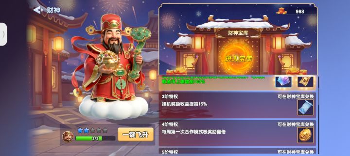 月卡党到3月14号前刚好有接近6000钻石100个召唤卷全部召财神能到5阶就好了,然后用飞升石直接飞6阶只长久每天领2炉子2高招卷,换东西就算了不沾边!6000钻石不能到5阶就直接无视了!坐等塔友们试水!