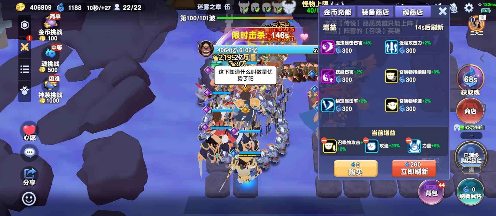 低配,装备也不好,12环英太乙,9云甄蔡花。天赋一个随机时间加智力的,一个守财,一个异常增伤。这把打小怪没什么压力,估计是守财的作用,以前会先选别的,这次没得选。 思路可供参考。 菜鸡难刷,刷了一千多魂也刷不出第二个索性不刷了,金币也吃不满,也没格子装装备。 宠物带红莲,放旁边上灼烧提供异常增伤,曹丕装一个减抗性的装备也放旁边,前期放鲁班附近。 花木兰眩晕加双破甲,控怪破防,穆桂英带落日套装雌雄叠