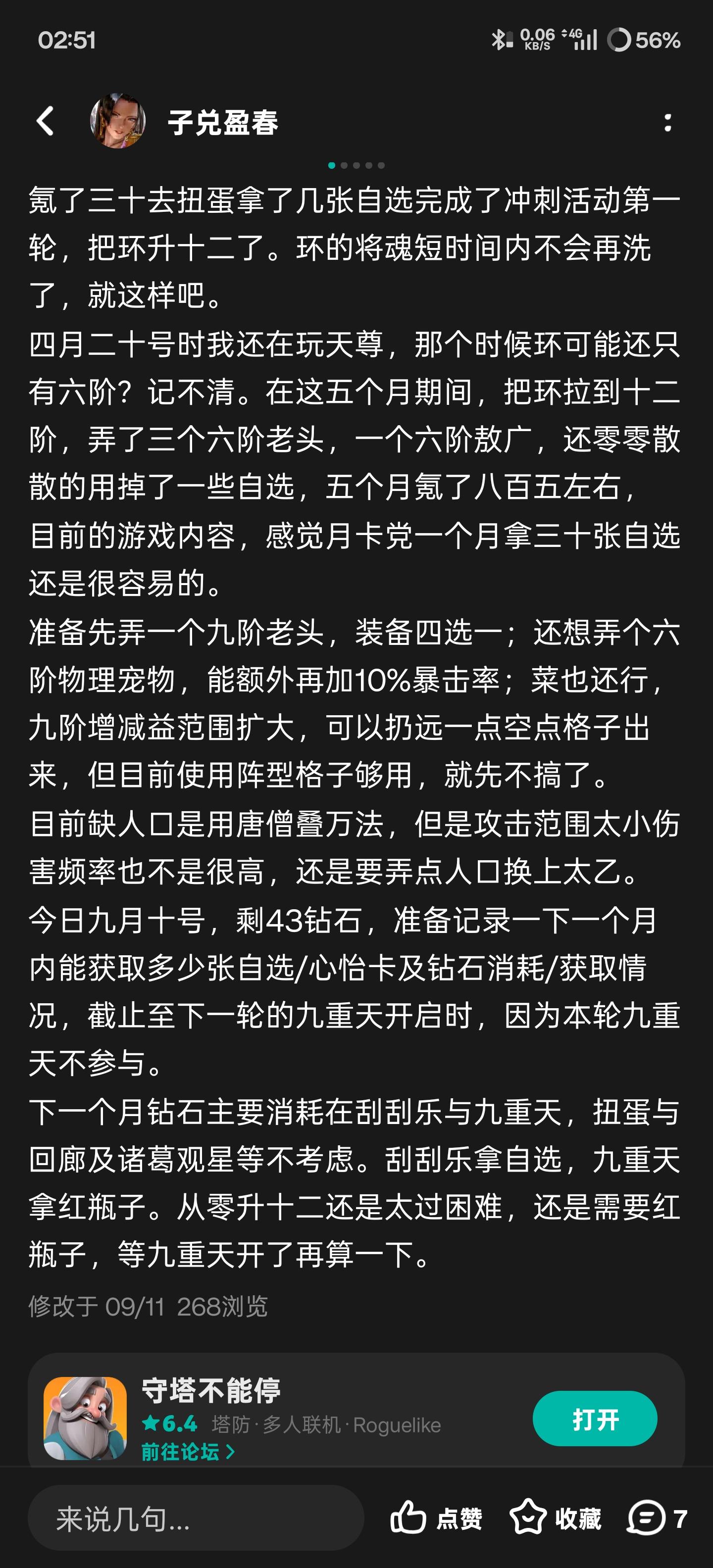 五月还没解锁完炼金图鉴六月被人带第一次过困难无尽九月养成十二环九月至十二月,三个月时间,三老头六阶升九阶,抽空升了一个九阶菜籽。三个月四个九阶。云和白是瓶子转的,也可以算六个九阶。 4×65=260 6×65=390 三个月时间获得的自选卡,大致上。平均一个月也有八十到一百多张吗?不太对吧?不能对吧?噢,那时候菜籽是七阶?我现在背包里还有四十来张卡,但是。对了,菜籽是转六白嫖到七升九,
