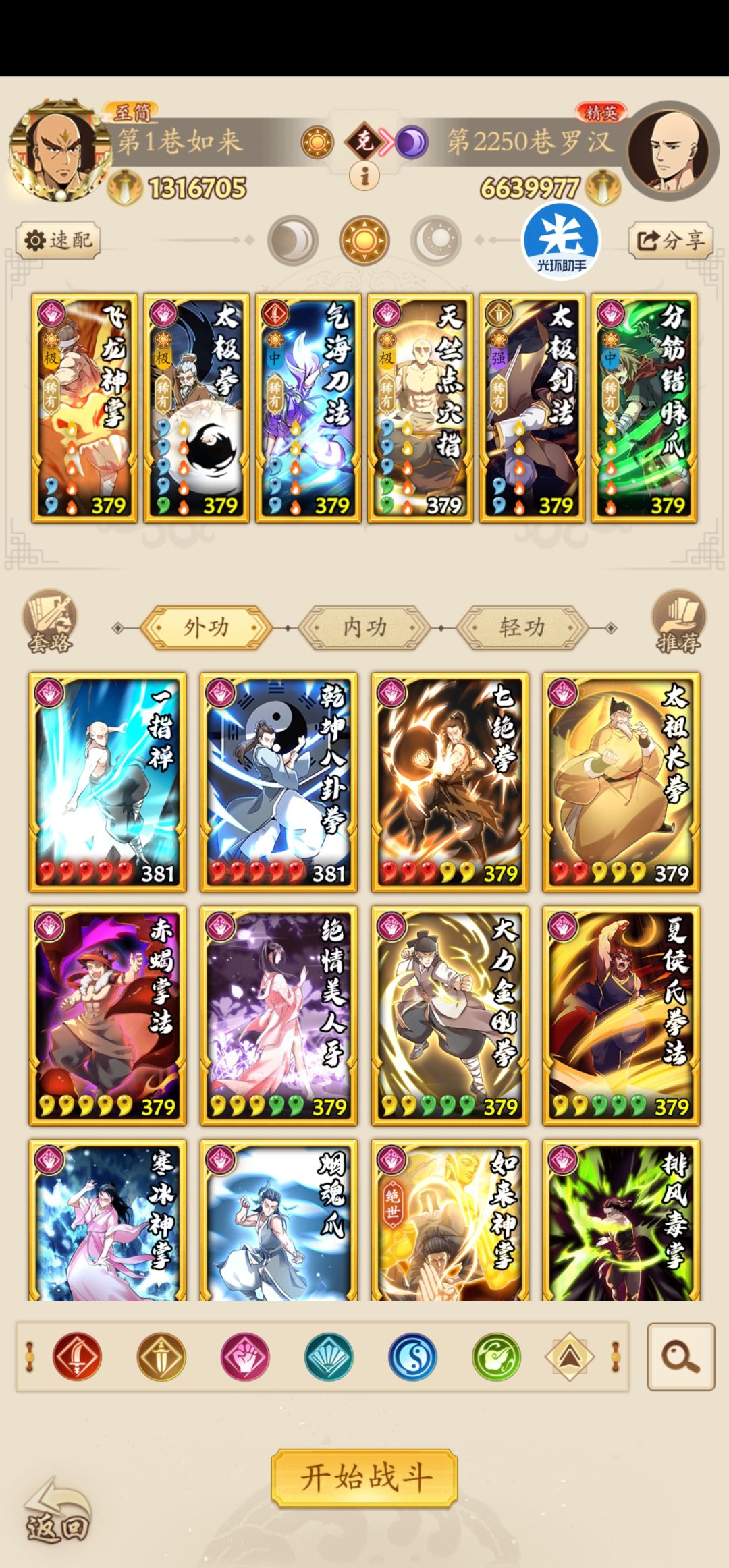 这一套就是传说中直通2500的模板,经过实践总结出一些微调技巧,供各位参考 ①外功带的的招式是雷打不动的,只有顺序需要调整 ②前3个外功可以根据对面起手的技能调整,原则就是飞龙控住出手后手,气海控住精进,太极吃到对面的出手;飞龙和气海谁在前,谁就带无羁佛心,在后的带苍龙慈航。 ③四五号位的天竺和太极雷打不动,回血加佛本无敌续航 ④最后一手三个选择,分筋错骨爪是最普适的,心惊加血瘀吊的一比;
